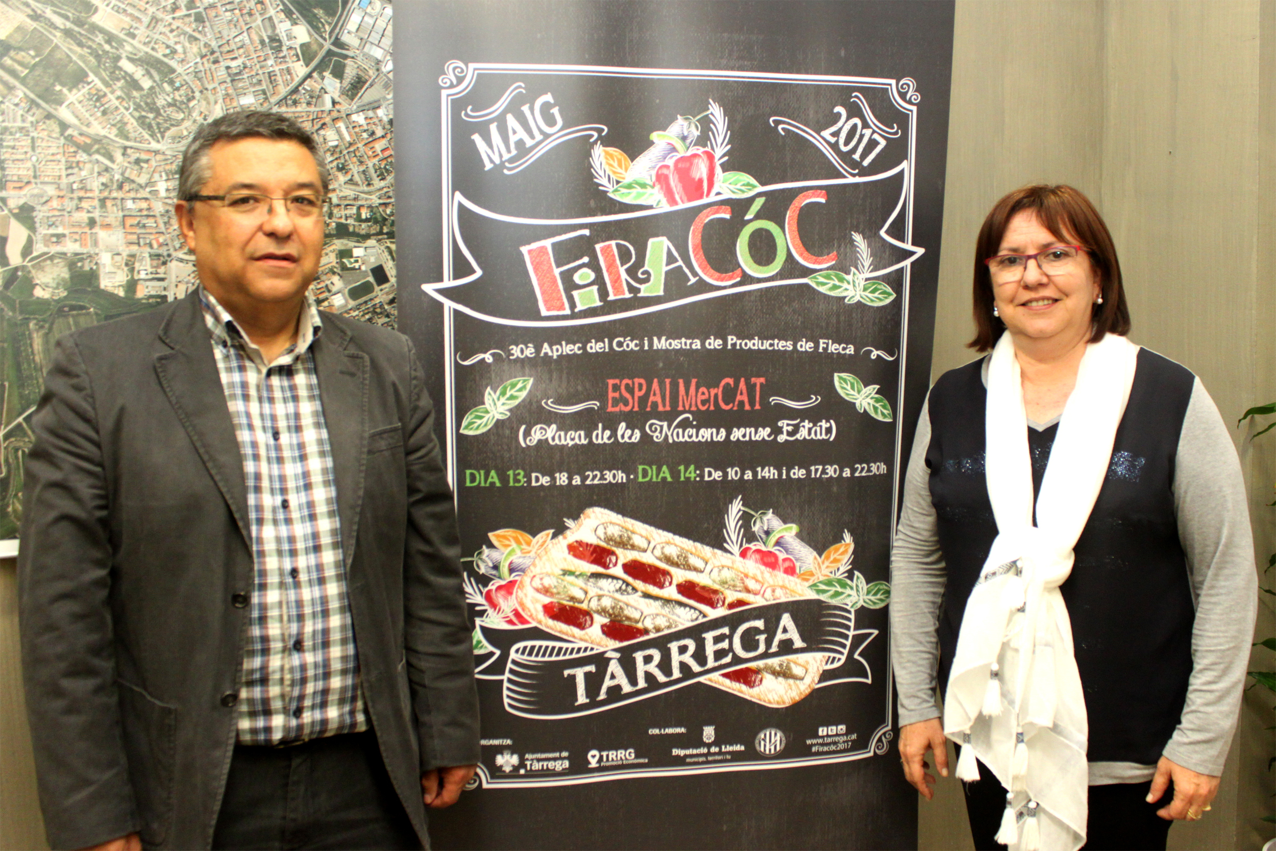 Fotografia: L’alcaldessa Rosa Maria Perelló i el regidor de Promoció Econòmica, Carles Pascual, mostren el cartell de la Firacóc 2017 de Tàrrega