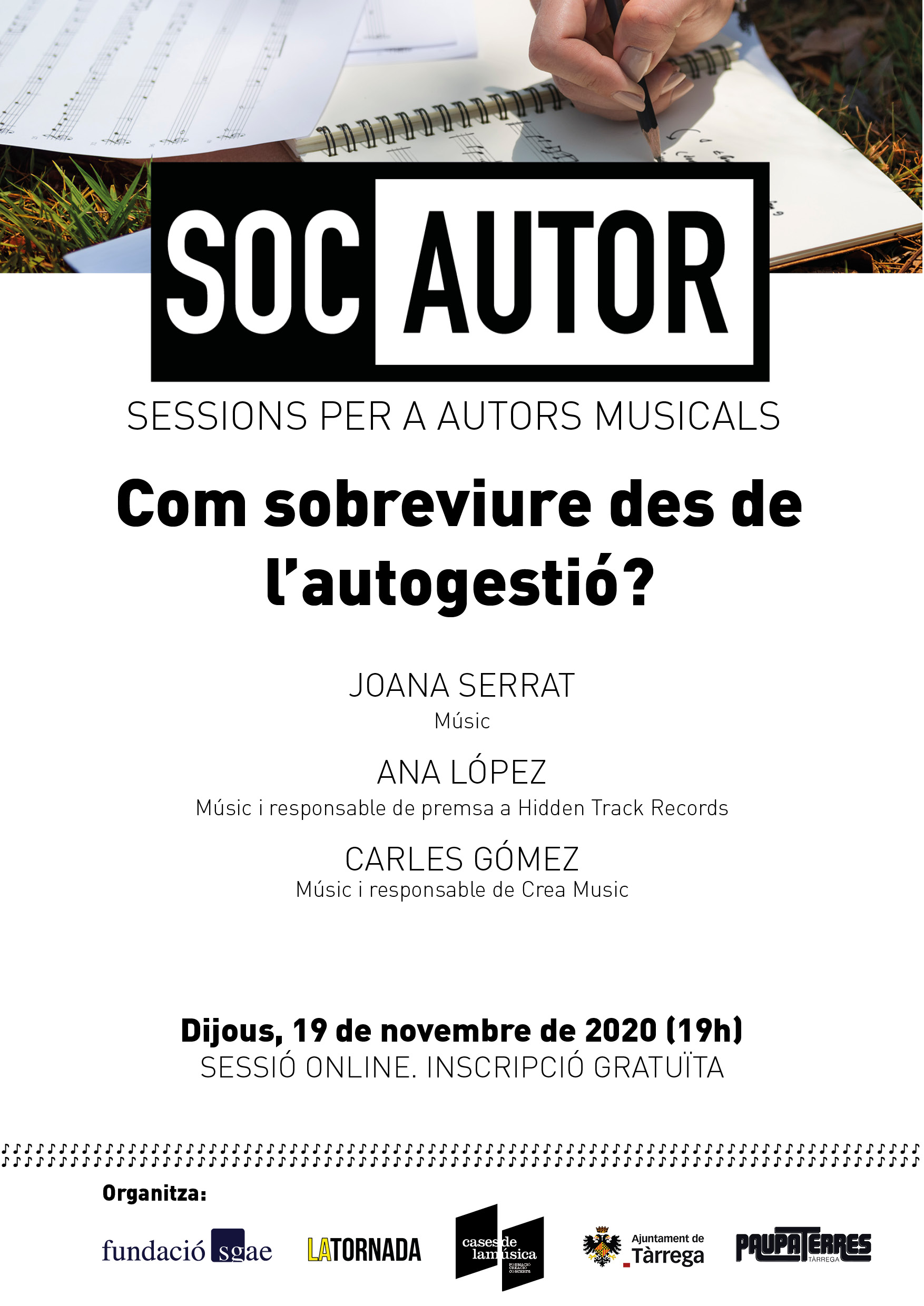 És per això que el programa Soc Autor, impulsat per la Fundació SGAE, La Tornada i les Cases de la Música, proposa una jornada virtual sobre l’autogestió que tindrà lloc el dijous, 19 de novembre, a les 19 hores. La sessió, que inicialment estava prevista de forma presencial a Tàrrega (Lleida), s’adapta a la situació actual, mantenint la complicitat i el suport de l’ajuntament targarí.