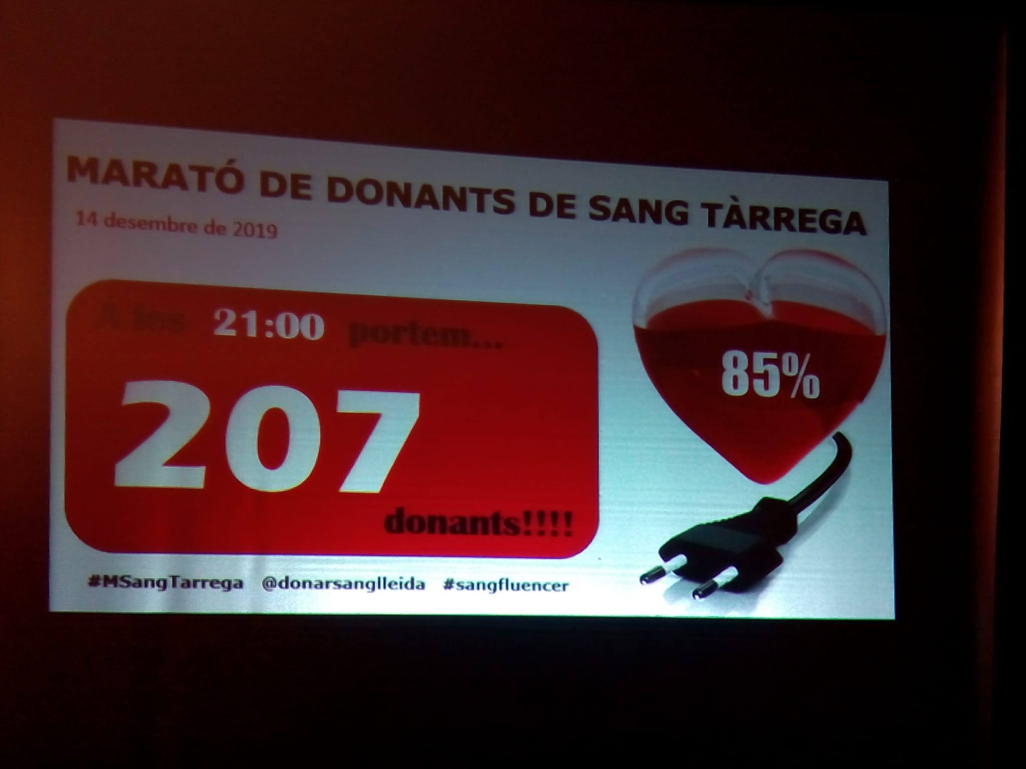 l’organització La Marató de Donants de Sang de Tàrrega s’ha tancat amb un balanç de 207 donacions després de 9 hores de donació al Casal Cívic (antiga llar de jubiltats)de la vila.