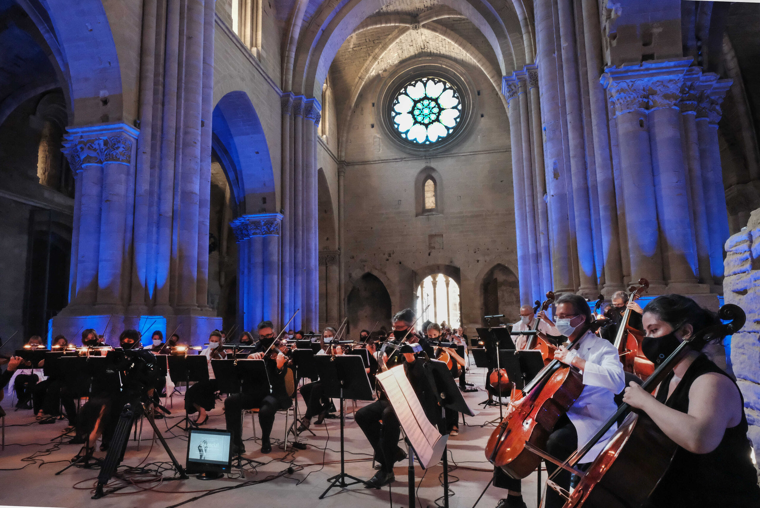 La nau central de la Seu Vella de Lleida ha acollit aquest vespre el concert ‘Essencial. Tothom per tothom’, un esdeveniment musical impulsat per la Diputació de Lleida a través de l’Institut d’Estudis Ilerdencs (IEI), en col·laboració amb la Paeria de Lleida i la delegació del Govern de la Generalitat a Lleida, en record de les víctimes de la Covid-19 i en reconeixement a totes aquelles persones que han estat en primera línia durant la crisi sanitària. El concert, d’una hora de durada, ha anat a càrrec de 65 músics de l’Orquestra Simfònica Julià Carbonell (OJC) de les Terres de Lleida i l’Orquestra de Metges Ars Mèdica, (única orquestra de càmera integrada per personal sanitari de l’Estat i impulsada pel Col·legi de Metges de Barcelona), sota la direcció d’Alfons Reverté, director de l’OJC.