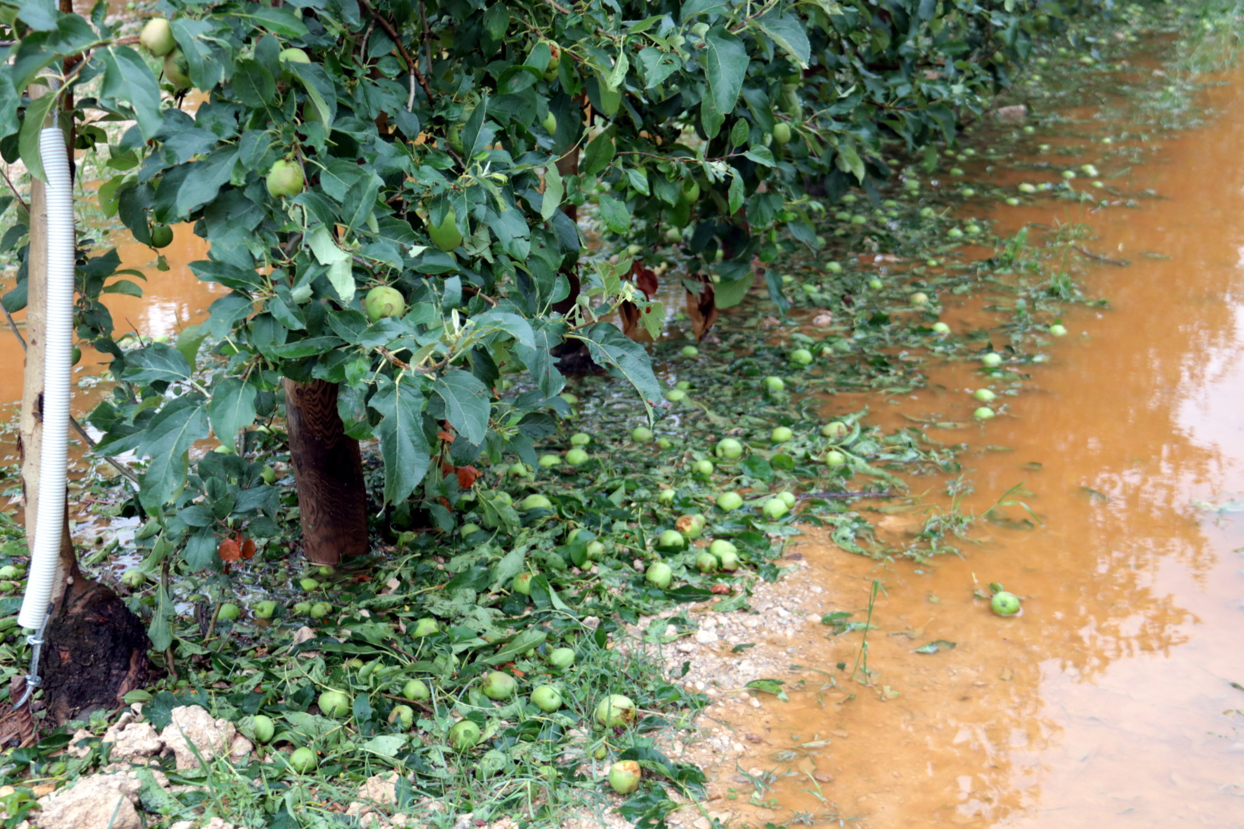 Imatge de pomes al terra per la pedregada en un camp de Bellpuig, el 4 de juny del 2020. (Horitzontal)