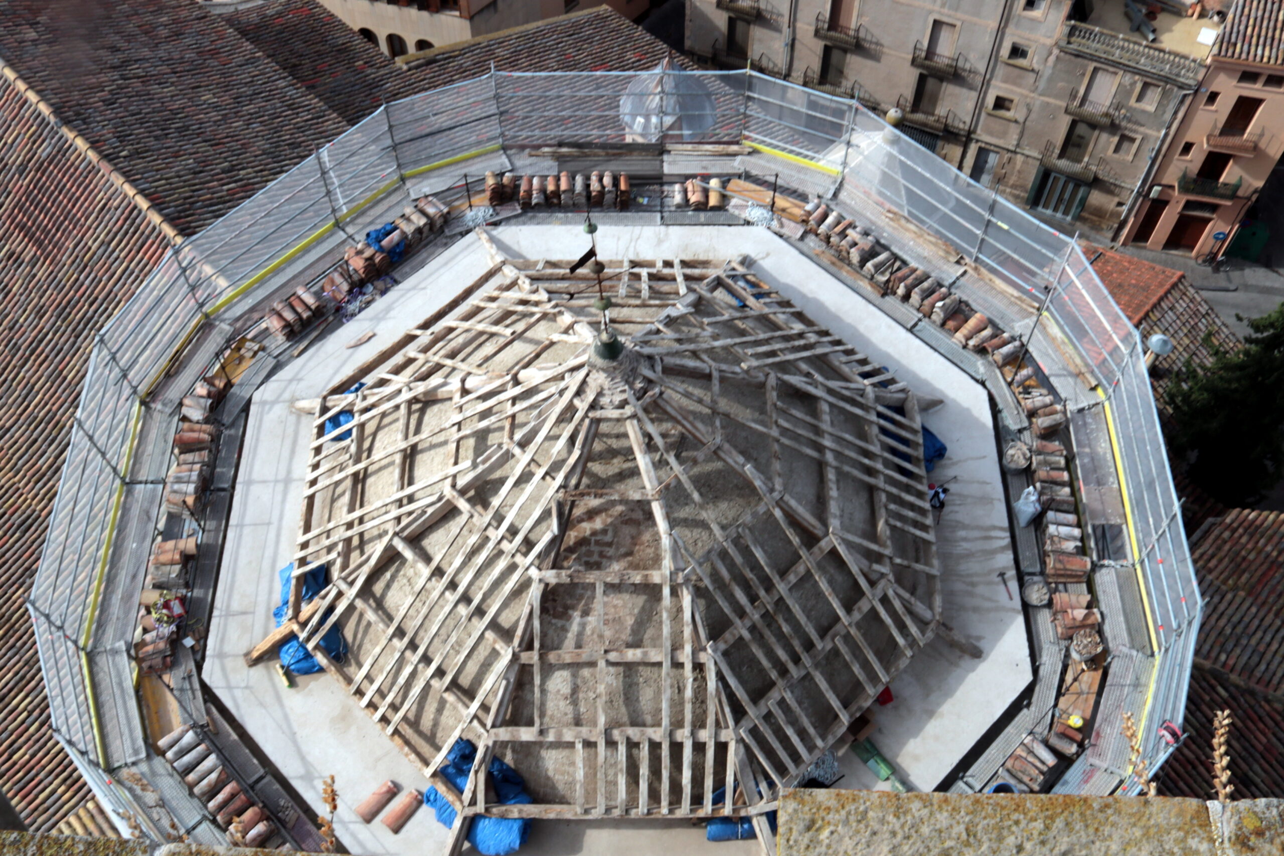 ACN Tàrrega .- Les obres de restauració de la coberta del cimbori de l’església parroquial de Santa Maria de l’Alba de Tàrrega avancen a bon ritme. El projecte se centra en la impermeabilització de l’estructura per solucionar problemes de filtracions i humitats, però inclou també la rehabilitació de les façanes associades al cimbori, la reposició de teules, el reforç de bigues, la millora de la recollida d’aigües pluvials i l’eliminació de vegetació arrelada a les parets del campanar. Durant els treballs, que van començar a l’agost i que es preveu s’acabin entre finals d’any o principis del vinent, s’ha pogut constatar el bon estat de les fustes de la sotacoberta i també han aparegut careners vidriats verds originals sota dels actuals i de les teules.