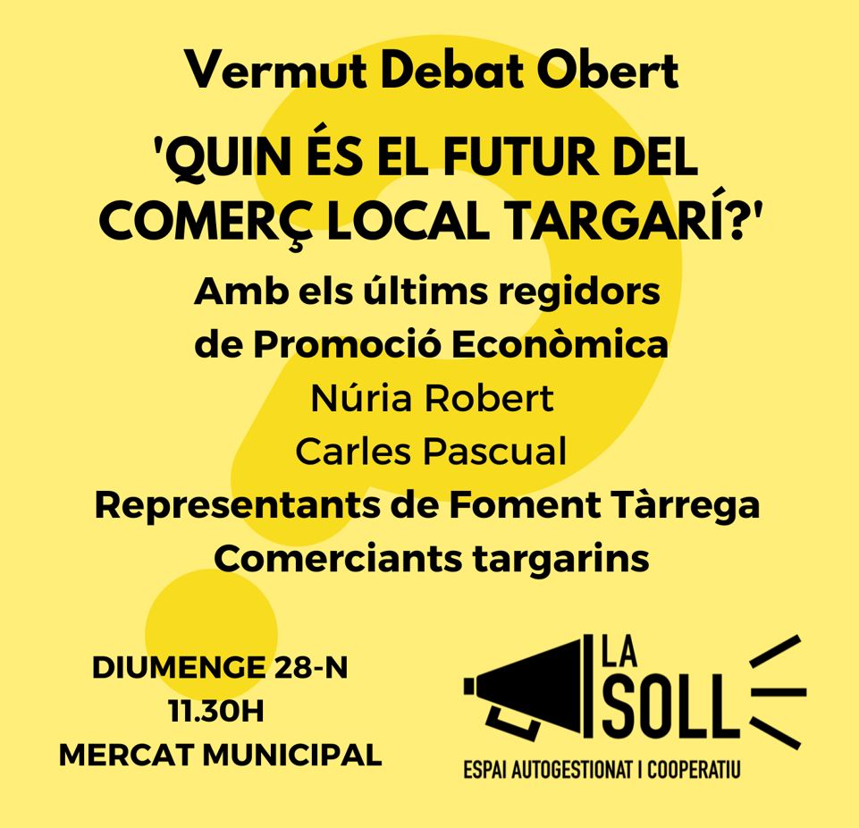 Aquest serà el segon debat que organitza La Soll sobre el model de ciutat després del realitzat al setembre del 2020 sobre el model cultural targarí amb els últims 4 regidors de cultura de l’Ajuntament de Tàrrega. L’objectiu de l’entitat es anar organitzant trobades d’aquestes característiques en els pròxims mesos i debatre sobre diferents temàtiques que afectin la ciutat.