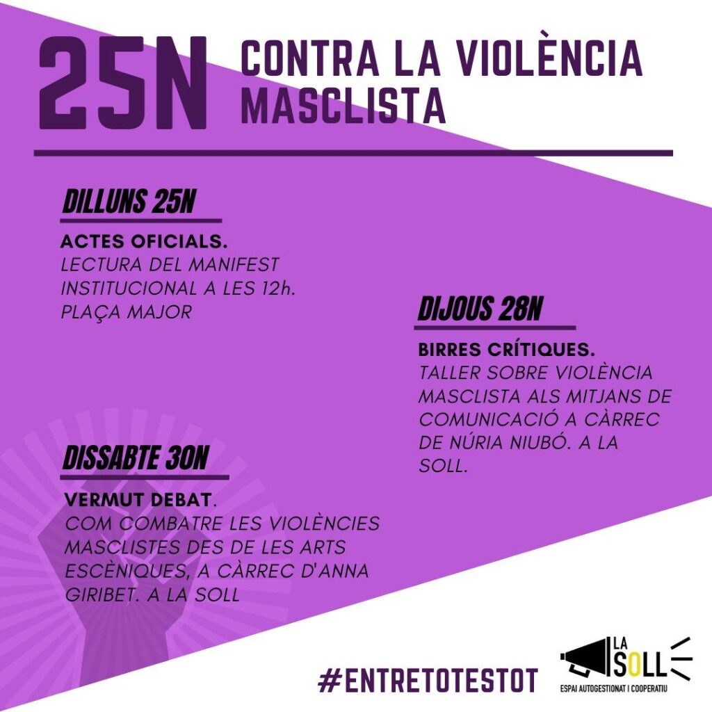 El pròxim dilluns 25 de novembre es celebra el dia contra la violència masclista i l’espai autogestionat i cooperatiu de La Soll prepara un seguit d’actes durant la setmana, oberts a tota la ciutadania.