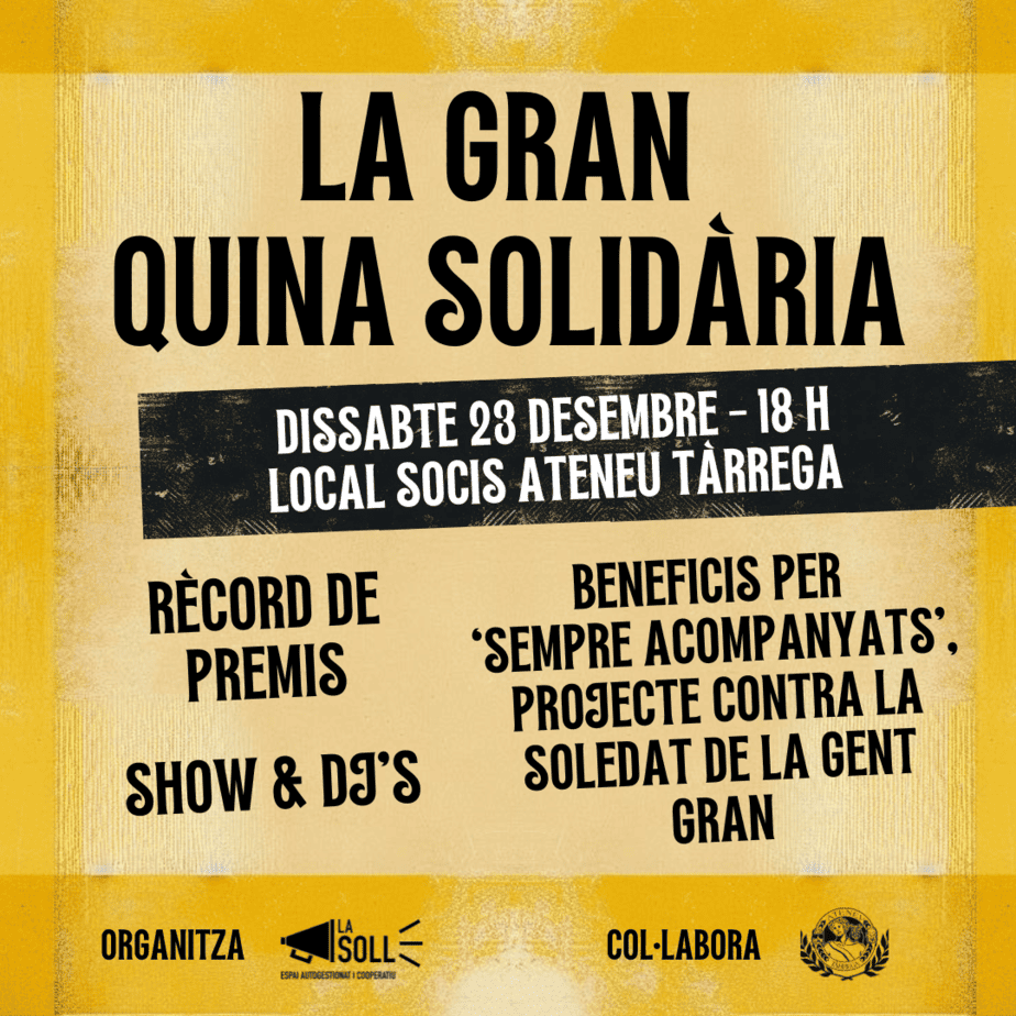 La Soll de Tàrrega organitza el pròxim dissabte 23 de desembre a partir de les 18h la Gran Quina Solidària al Local de Socis de l’Ateneu, que col·labora en aquesta edició del popular joc nadalenc típic de Catalunya. El funcionament de la Quina consisteix en uns cartrons amb números de l’1 al 100 que s’han d’anar omplint a mesura que el canari va cantant els números del bombo.