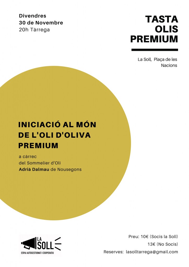 La Soll realitzarà un TastaOlis Premium per inciar-se en el món dels olis d’olives el divendres 30 de novembre a les 20 h