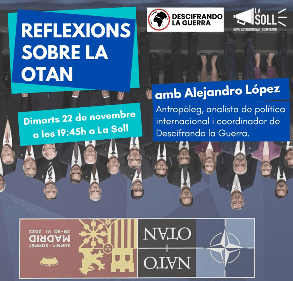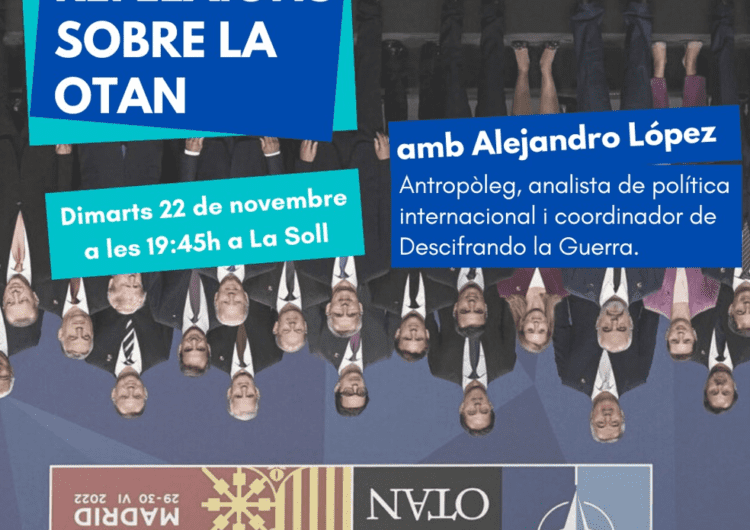 El pròxim dimarts 22 de novembre a les 19.45h, l’espai cooperatiu La Soll ha convidat una xerrada oberta per reflexionar sobre l’OTAN amb l’antropòleg Alejandro López, analista de política internacional i coordinador de Descifrando la Guerra. Aquest mitjà independent s’ha convertit en un referent dels amants de la política internacional i compta amb més de 500.000 seguidors a les diverses xarxes socials.
