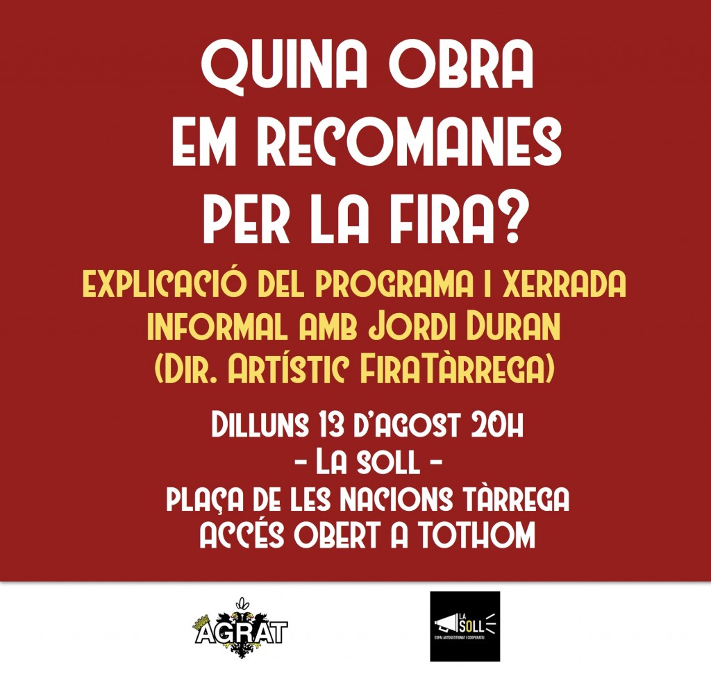 L’associació Agrat i l’espai autogestionat La Soll organitzaran el dilluns 13 d’agost a les 8 del vespre una xerrada amb el director artístic de FiraTàrrega, Jordi Duran, sota el nom “Quina obra em recomanes per la Fira?”. L’objectiu és conèixer la programació d’aquesta edició i saber quines obres escollir a l’hora de triar espectacles o comprar entrades.