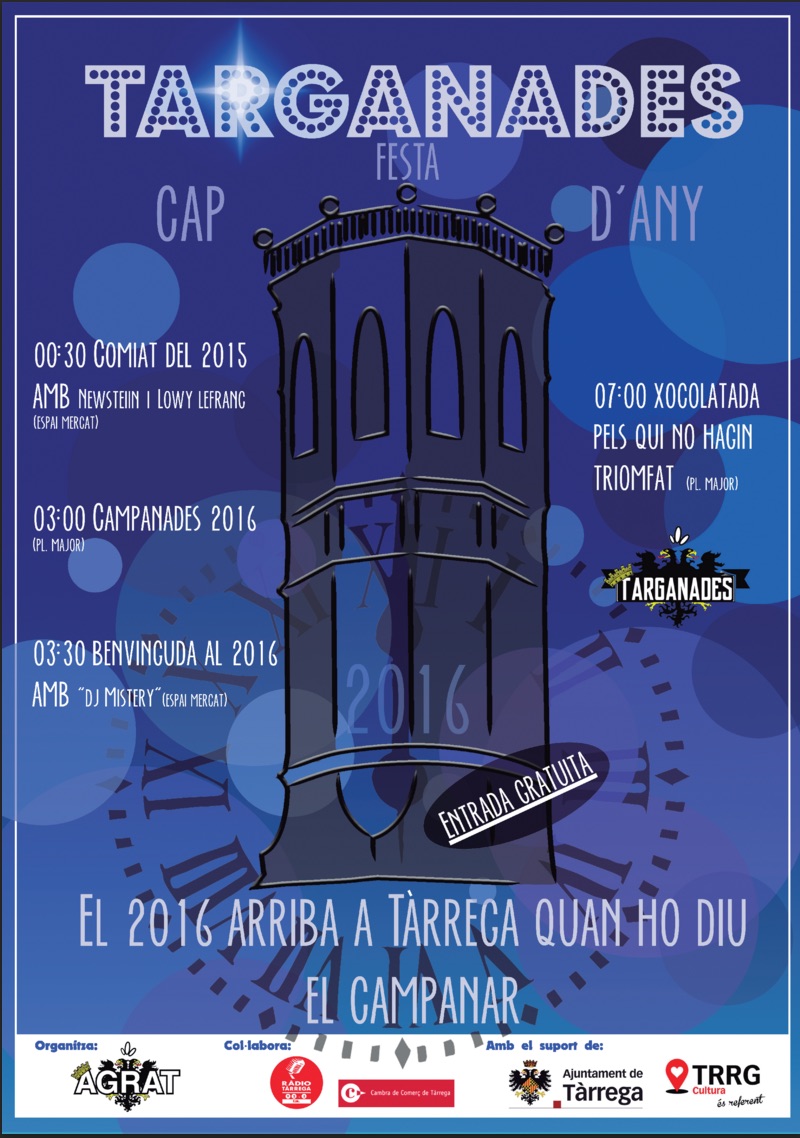 L’Associació Agrat organitzarà per primera vegada el cap d’any de Tàrrega amb unes campanades a les 3 de la matinada a la Plaça Major i amb tota la festa anterior i posterior a l’espai MerCat. Per organitzar-ho s’ha creat la nova comissió de Targanades, nom que tindrà l’esdeveniment. La nit començarà a les 12 quan s’obriran les portes de l’espai MerCat per acomiadar el 2015 amb la música electrònica de la mà dels DJ’s Lowy LeFranc i Newstein. A les 3 de la matinada es convocarà a tothom a la Plaça Major on començarà el show de la mà dels millors presentadors de la història, Alba Coma i Pere Noró, dues cares conegudes per a tots els targarins.