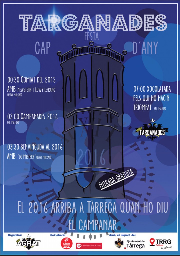 Resum de l’any, petonada popular i els dotze segons més esperats de l’any. Un cop acabat el show, la festa continua a l’espai MerCat amb la patxanga de DJ Mistery fins que les cames diguin prou. Un cop acabada la festa, xocolata desfeta pels que no hagin triomfat. Tota la informació relacionada amb el cap d’any la podeu trobar a la pàgina de facebook de l’Agrat i a l’esdeveniment del facebook “Targanades 2016 – Cap d’any a Tàrrega”.