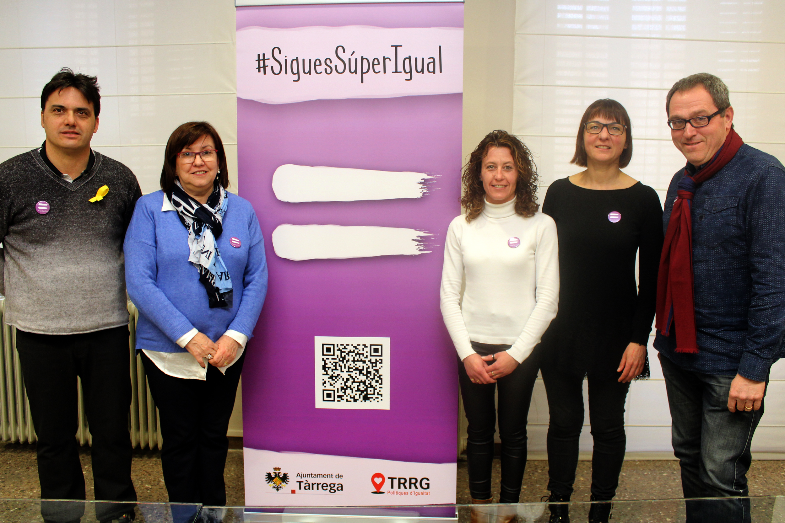 Fotografia: L’alcaldessa Rosa Maria Perelló; el regidor de l’Àrea de Polítiques de la Ciutadania, Jaume Folguera; la regidora de Polítiques d’Igualtat, Núria Franquesa; la coordinadora de Polítiques d’Igualtat, Mireia Fontanet; i el director dels Museus de Tàrrega, Jaume Espinagosa; amb la imatge identificadora de la campanya #SiguesSúperIgual