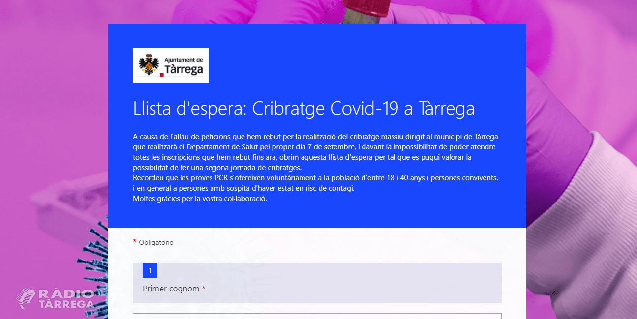 L’Ajuntament de Tàrrega ha tancat  el formulari d’inscripció en línia que permetia accedir al cribratge massiu de COVID-19 habilitat al web municipal. S’han rebut un total de 462 sol·licituds per fer les proves PCR, superant amb escreix la previsió situada inicialment entre 300 i 400 tests. L’Ajuntament ha agraït la bona resposta de la ciutadania i ha habilitat al mateix enllaç una llista d’espera per recollir noves peticions i avaluar una possible segona jornada de cribratges a la capital de l’Urgell.