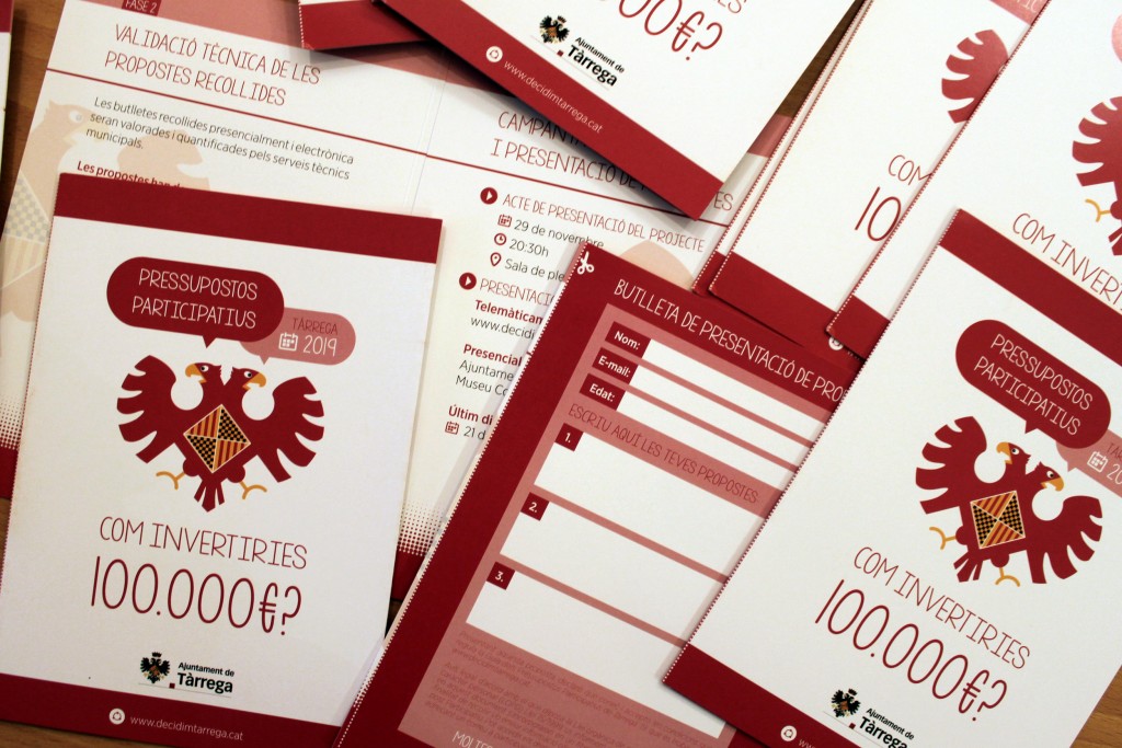 Fase 1: Campanya informativa i presentació de propostes. L’Ajuntament de Tàrrega oferirà un acte de presentació del projecte aquest dijous 29 de novembre, a 2/4 de 9 del vespre, a la Casa Consistorial. La ciutadania podrà fer arribar les seves propostes de forma telemàtica mitjançant el web www.decidimtarrega.cat i de forma presencial en bústies instal·lades a l’Ajuntament de Tàrrega, el Centre d’Entitats, la Biblioteca i el Museu Comarcal de l’Urgell – Tàrrega. El consistori efectua el repartiment porta a porta d’un fulletó informatiu en què es detalla el procés participatiu i que inclou la butlleta de presentació de propostes. El mateix document també es pot descarregar des del web municipal i xarxes socials. El termini, com s’ha dit, finalitzarà el proper 21 de desembre.