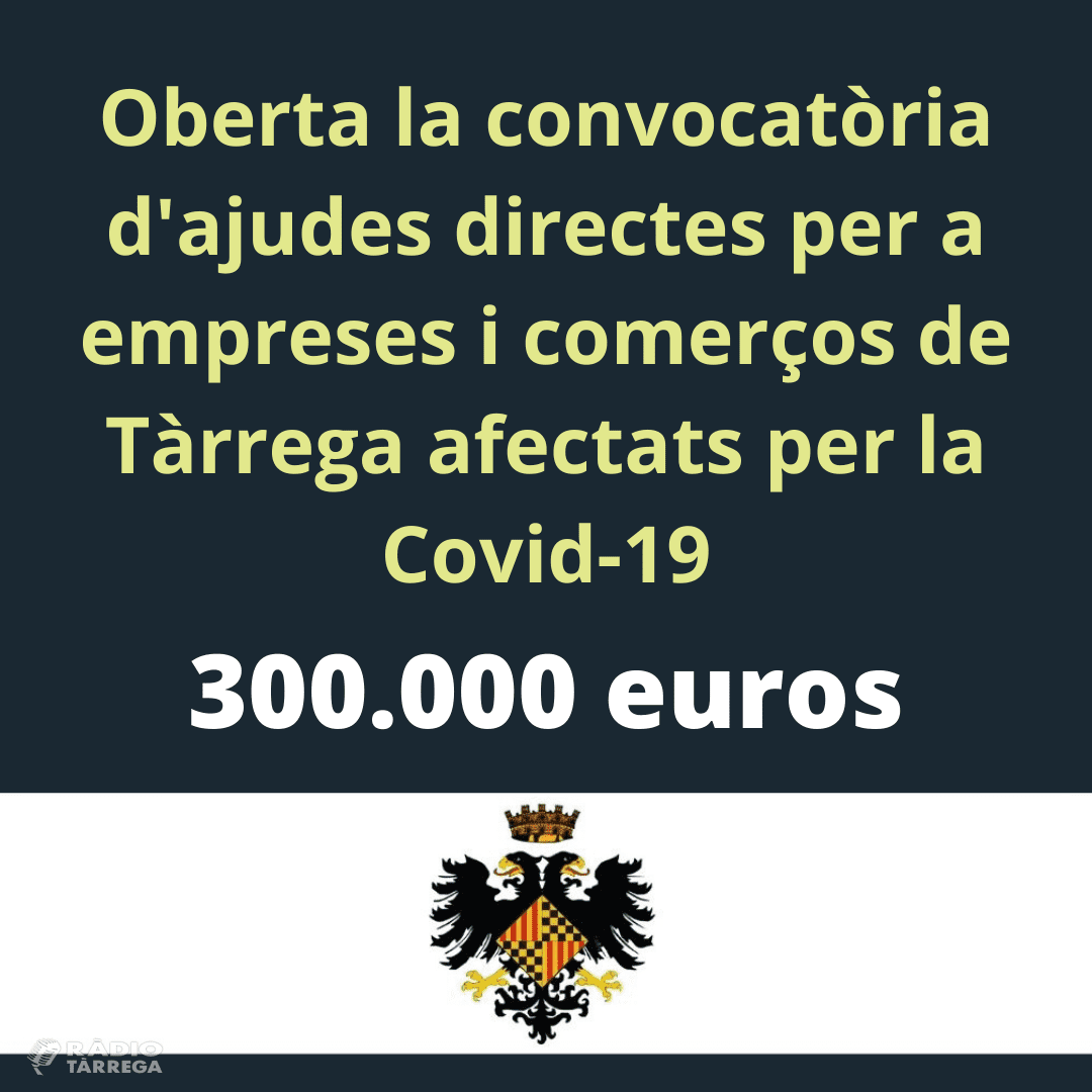 La Regidoria de Promoció Econòmica de l’Ajuntament de Tàrrega ha obert la convocatòria d’una línia d’ajudes que ascendeix fins als 300.000 euros per als negocis locals que s’hagin vist afectats per la crisi provocada per la pandèmia de la Covid-19. Empreses i autònoms amb la seva activitat a Tàrrega, segons el document 036 o 037 de la declaració censal d’hisenda, poden sol·licitar-la fins al proper 30 de setembre.