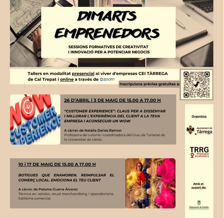 La Regidoria de Promoció Econòmica de l’Ajuntament de Tàrrega organitza una nova edició de les càpsules formatives adreçades a les empreses i establiments comercials del territori. En aquests tallers, anomenats Dimarts emprenedors, s’incideix en fomentar la creativitat i la innovació dels negocis amb l’objectiu de millorar l’experiència dels seus clients. En aquest sentit, la regidoria que encapçala Núria Robert ha programat tres sessions formatives, que enguany es tornaran a celebrar en format presencial al Centre d’Empreses Innovadores situat a Cal Trepat. Ara bé, també s’ofereix la possibilitat de seguir els tallers per internet a través de la plataforma Zoom.