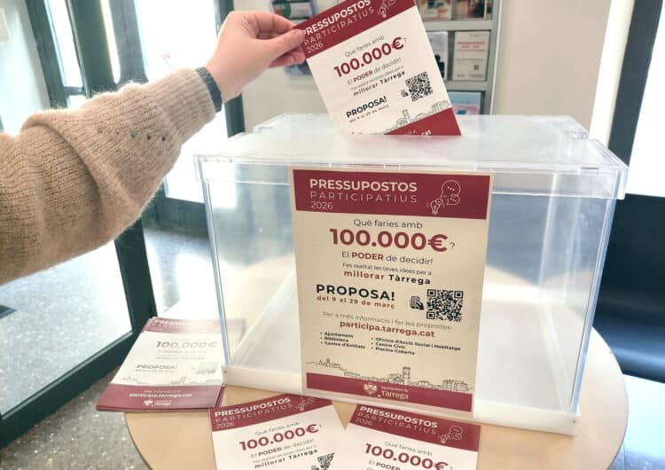 Fase 1: Presentació de propostes – La ciutadania podrà fer arribar les seves propostes del 9 al 29 de març de forma telemàtica mitjançant el web participa.tarrega.cat i de forma presencial en bústies instal·lades a l’Ajuntament, la Biblioteca Germanes Güell, el Centre d’Entitats, l’Oficina d’Acció Social i Habitatge, el Casal Cívic i el Complex Piscines Tàrrega. El consistori també lliurarà porta a porta un fulletó que detalla el procés participatiu i inclou una butlleta física de presentació de propostes.