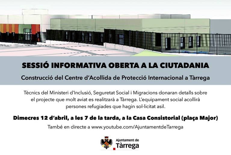 L’Ajuntament de Tàrrega i el Ministeri d’Inclusió, Seguretat Social i Migracions han convocat una sessió informativa oberta a la ciutadania per a donar detalls del Centre d’Acollida de Protecció Internacional (CAPI) que l’Estat preveu construir a la ciutat. L’acte se celebrarà el proper dimecres 12 d’abril, a les 7 de la tarda, a la Casa Consistorial, amb la participació de tècnics de l’esmentat ministeri. La sessió també s’emetrà en streaming al canal de YouTube de l’Ajuntament de Tàrrega: www.youtube.com/ajuntamentdetarrega.