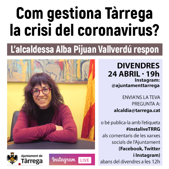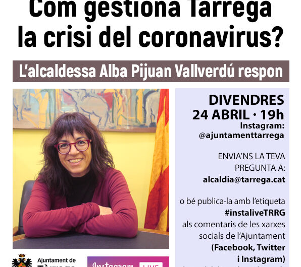 L’alcaldessa de Tàrrega, Alba Pijuan Vallverdú, intervindrà en directe a la xarxa social Instagram per respondre les preguntes que formuli la ciutadania arran de la crisi del coronavirus. L’emissió tindrà lloc el divendres 24 d’abril, a les 7 de la tarda, a través del recurs Live del compte d’Instagram @ajuntamenttarrega. Veïns i entitats ja poden trametre les seves preguntes des d’avui dilluns i fins divendres a les 12 del migdia enviant un correu electrònic a [email protected]. També es pot publicar la pregunta directament als comentaris dels comptes de l’Ajuntament de Tàrrega a Instagram, Facebook i Twitter amb l’etiqueta #instaliveTRRG. La crida també és oberta als mitjans de comunicació.