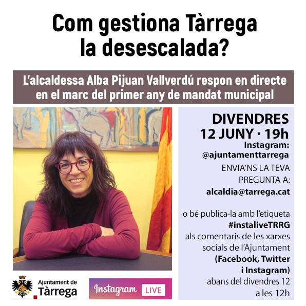 L’alcaldessa de Tàrrega, Alba Pijuan Vallverdú, respondrà en directe mitjançant el compte d’Instagram @ajuntamenttarrega les preguntes formulades per la ciutadania el proper divendres 12 de juny (19h). La intervenció, a través de l’Instagram Live, se centrarà en la gestió de la desescalada i coincidirà amb el primer any de l’actual mandat municipal. Les preguntes es poden fer arribar per correu electrònic ([email protected]) o publicant-les als murs de comentaris del Facebook, Twitter i Instagram de l’Ajuntament de Tàrrega etiquetant #instaliveTRRG, abans de les 12 del migdia del divendres 12 de juny.