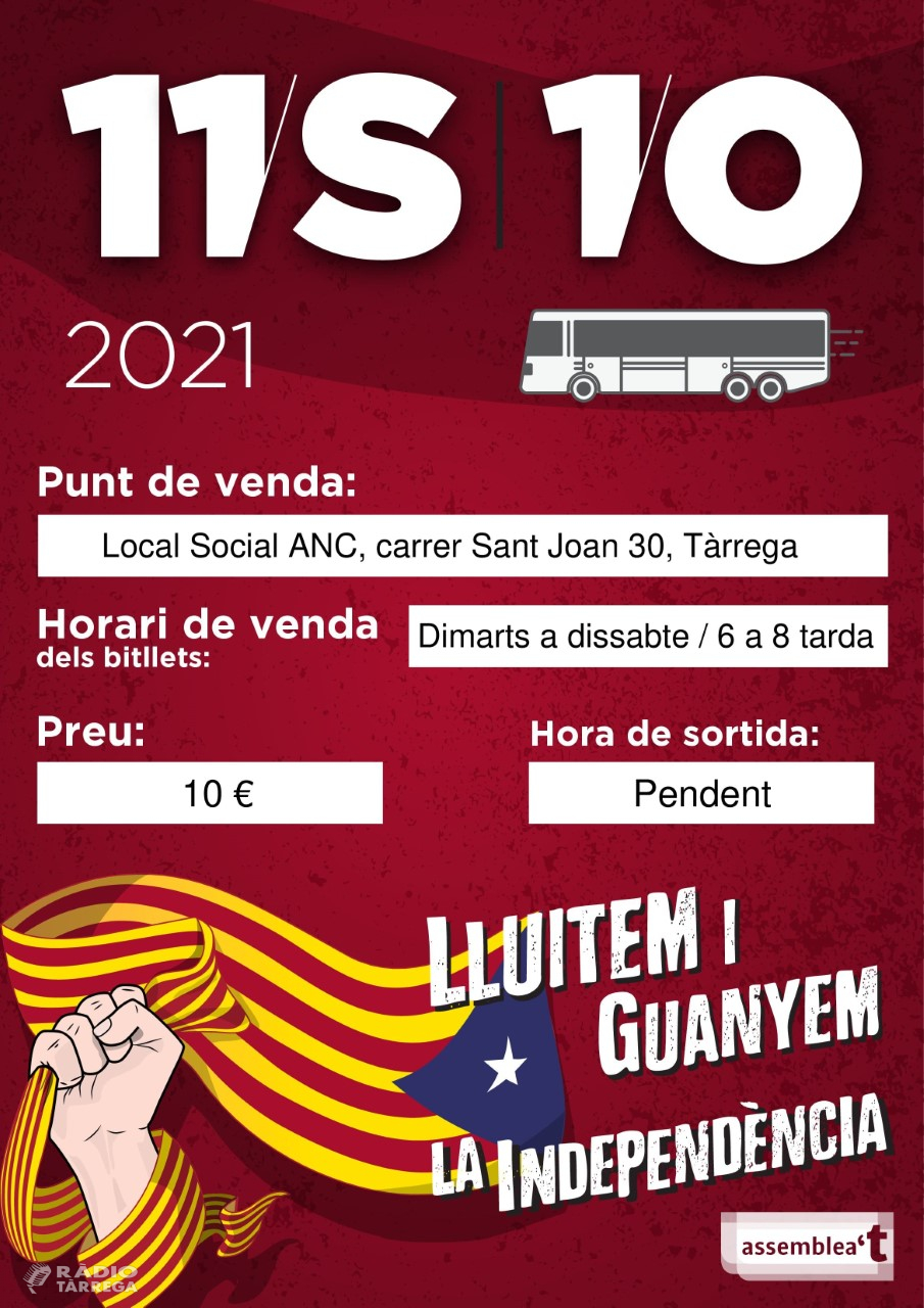 Els autobusos sortiran del carrer Joan Tous (La Tassa) de Tàrrega. Més endavant s’anunciarà l’hora de sortida. Els tiquets tenen el preu de 10 € (viatge + assegurança). Les samarretes i tiquets es posaran a la venda al Local Social de l’ANC del carrer Sant Joan de Tàrrega de dimarts a dissabte de 6 a 8 de la tarda, i també a la parada del mercat dels dilluns.