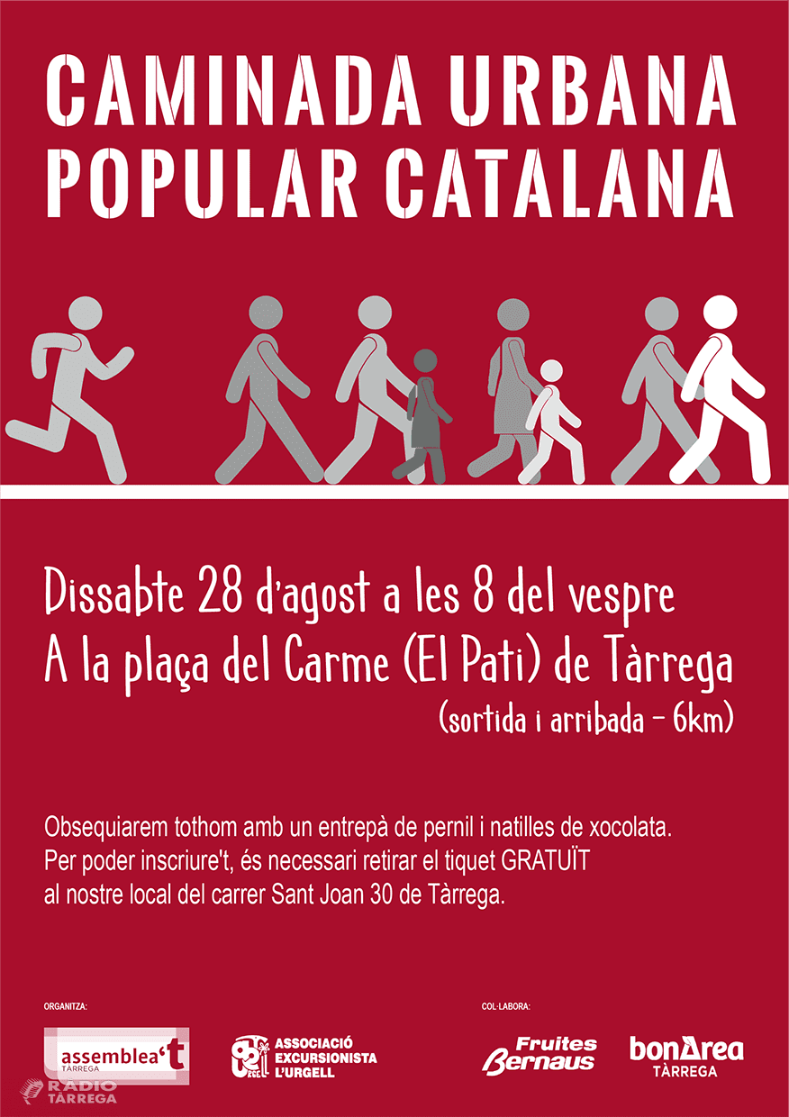 Com ja és habitual a l’equador de l’estiu, l’ANC de Tàrrega per la Independència organitza una caminada urbana popular catalana que tindrà lloc el proper dissabte 28 d’agost a les 8 del vespre. Es tracta d’un recorregut d’uns 6km, assequible per a tots els públics, que transcorrerà per bona part dels carrers de la ciutat. La ruta, que tindrà com a punt de sortida i arribada la plaça del Carme (El Pati), recorrerà els carrer Sant Pelegrí, plaça Rafael Casanova, carrer Roger de Llúria, carrer Blaia, carrer Pins, camí (avituallament), tossal del motocròs i Estelada, carrer Amics de l’Arbre, carrer Mestre Amigó, carrer Santes Espines. Enguany i donant compliment a les mesures sanitàries contra la covid-19 que recull el PROCICAT, el tradicional sopar es converteix en un sopar individual que els participants podran endur-se a casa seva: un entrepà de pernil i natilles de xocolata. Caldrà a més que tots els participants duguin la mascareta i respectin la distància social d’un metre i mig.