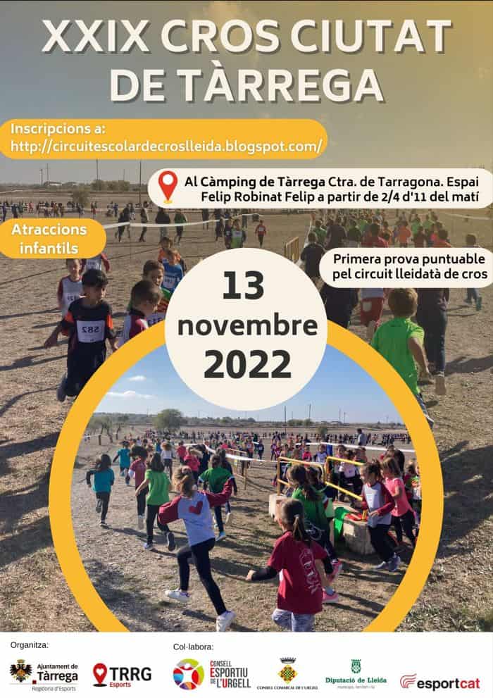 El Cros Ciutat de Tàrrega es prepara per celebrar la seva 29a edició el proper diumenge 13 de novembre. La cita, organitzada per la Regidoria d’Esports, esdevindrà la primera prova puntuable per al Circuit Escolar de Cros que organitza l’ATCELL amb la col·laboració de la Diputació de Lleida. L’escenari de les competicions serà com de costum el Càmping Municipal – Espai Felip Robinat Felip, recinte on s’habilitaran diferents circuits amb distàncies d’entre 500 i 7.200 metres (per als corredors més petits, circuits de 40 a 80 metres). A partir de 2/4 d’11 del matí s’anirà donant sortida a 12 curses de camp en què competiran 19 categories diferents: veterans, oberta, juvenil, cadet, infantil, aleví, benjamí i prebenjamins (masculina i femenina) a més de minis P5, P4 i P3.