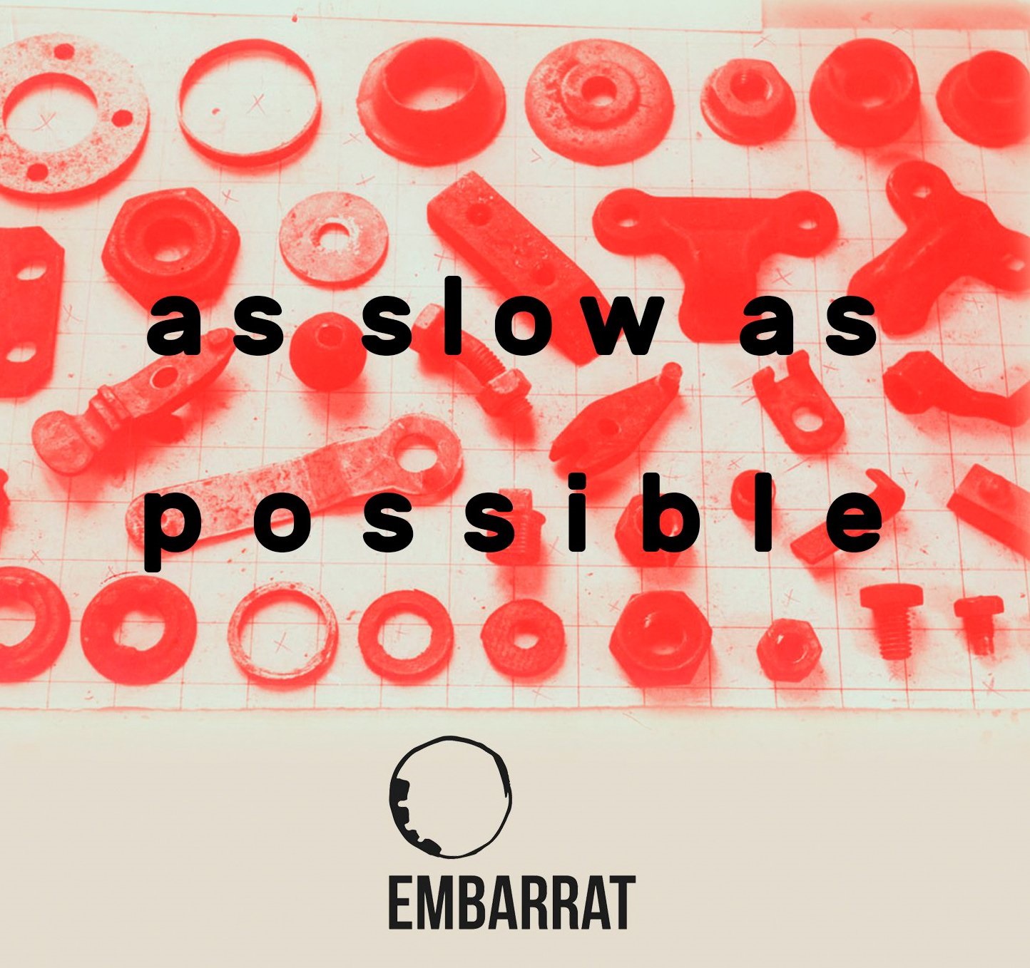 Els comissaris Jesús Vilamajó i Alexandra Laudo procediran ara a seleccionar la vintena d’obres que es mostraran dins l’exposició central de l’Embarrat, anomenada La Gran Màquina. El llistat es farà públic a principis d’abril. L’Embarrat ha plantejat enguany als creadors que reflexionin sobre el concepte de lentitud i necessitat de pausa en contraposició a la rapidesa i l’acceleració que impera a la societat actual. D’aquí el lema “As slow as possible” (“tan a poc a poc com sigui possible”). El títol s’inspira en l’obra homònima que el compositor John Cage va escriure l’any 1987 i que, com el seu nom indica, s’ha d’interpretar tan a poc a poc com es pugui. Fidel a la seva vocació avantguardista, el festival targarí anima els autors a expressar-se mitjançant diferents disciplines com el vídeoart, la fotografia, el disseny, l’street-art, el còmic, la música electrònica, les arts escèniques experimentals o qualsevol altre tipus de manifestació del pensament.