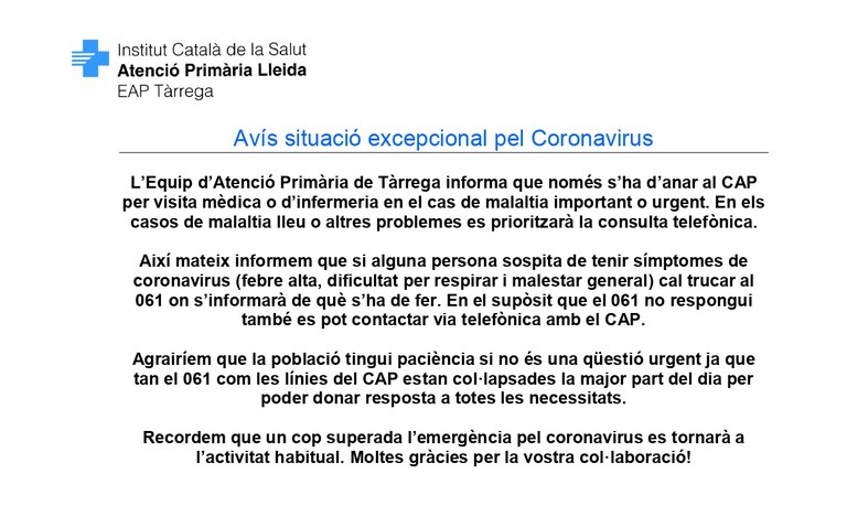 L’Equip d’Atenció Primària de Tàrrega informa que només s’ha d’anar al CAP per visita mèdica o d’infermeria en el cas de malaltia important o urgent. En els casos de malaltia lleu o altres problemes es prioritzarà la consulta telefònica. Així mateix, informem que si alguna persona sospita de tenir símptomes de coronavirus (febre alta, dificultat per respirar i malestar general) cal trucar al 061 on s’informarà de què s’ha de fer. En el supòsit que el 061 no respongui també es pot contactar via telefònica amb el CAP.