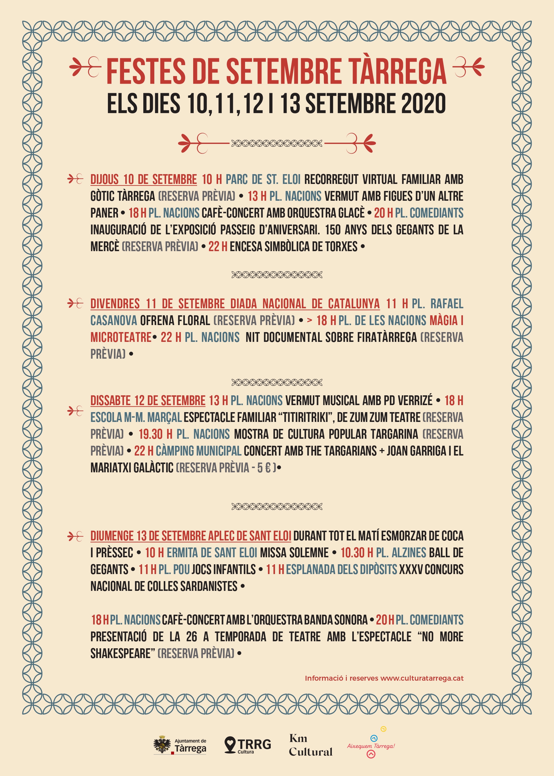 L’Ajuntament de Tàrrega ha dissenyat una nova programació cultural del 10 al 13 de setembre adaptant l’agenda a la situació actual de pandèmia. FiraTàrrega, esdeveniment de caràcter multitudinari previst per aquestes dates, ha ajornat el seu format habitual fins al 2021. Tanmateix, i per continuar reforçant la seva condició de pol cultural, la capital de l’Urgell oferirà una vintena d’activitats festives amb un caire més íntim i reduït. Música, cultura popular, tradició, arts i audiovisuals bastiran el programa, que també inclourà altres cites representatives del tram final de l’estiu com són la Diada Nacional de Catalunya i l’Aplec de Sant Eloi. La Regidoria de Cultura coordinarà la programació, englobada sota el nom de Festes de Setembre (evocant la Festa Major de setembre, embrió de l’actual FiraTàrrega).
