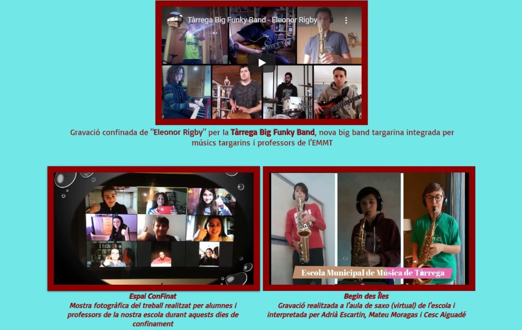 En marxa des del passat 2 de maig, l’Espai ConFinat ofereix vídeos alternant enregistraments fets en confinament amb gravacions anteriors de concerts realitzats per part d’agrupacions i solistes del centre. A l’abast de tothom, els continguts s’aniran ampliant durant els propers dies. La iniciativa s’ha complementat amb l’obertura d’un canal propi a YouTube, el qual s’estrenà durant la passada diada de Sant Jordi presentant el debut de la Tàrrega Big Funky Band, agrupació que engloba professorat i alumnat (actual i antic) de l’EMMT. D’aquesta forma, l’escola ha augmentat significament la seva presència a l’espai virtual i a les xarxes socials, ja que els vídeos també es publiquen al seu compte de Facebook.