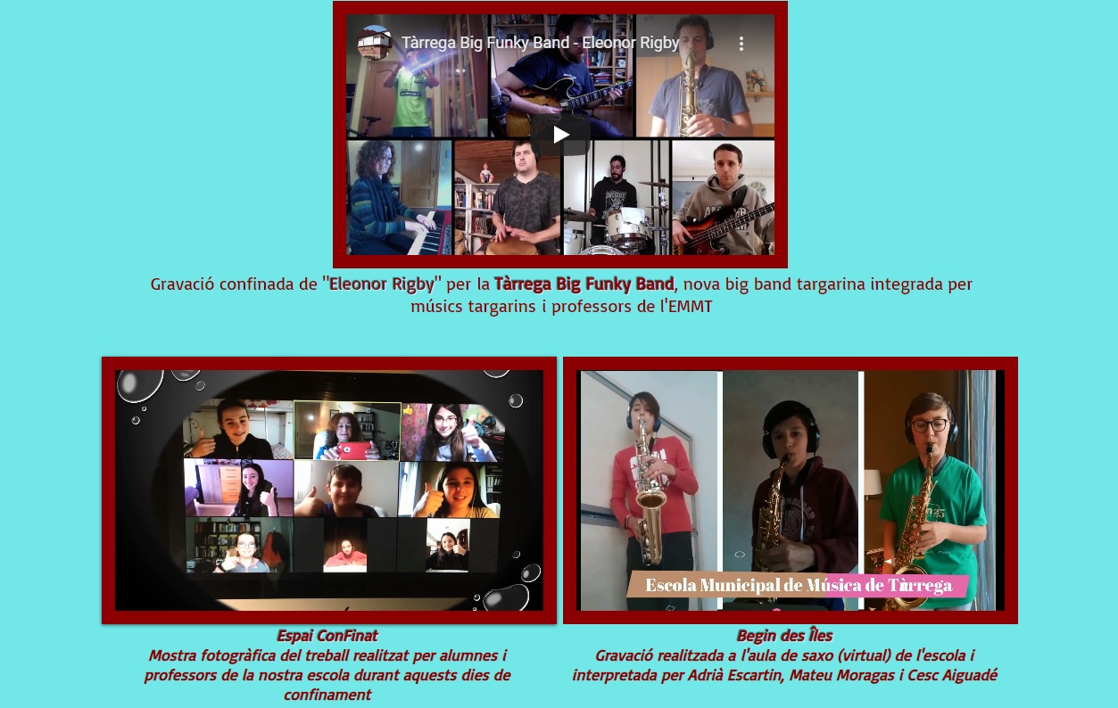 A l’Espai ConFinat, per exemple, ja s’hi poden trobar interpretacions en grup de saxo i piano modern, versions de jazz i pop-rock català, o un recull fotogràfic d’activitats de l’escola. No hi falta el vídeo de la Tàrrega Big Funky Band versionant el clàssic “Eleanor Rigby” dels Beatles. D’altra banda, i acostant-se ja la “Festa Major confinada” de Tàrrega, l’EMMT prepara una sorpresa per al dijous 14 de maig mitjançant la col·laboració entre professorat i alumnat sumant la participació de músics targarins.
