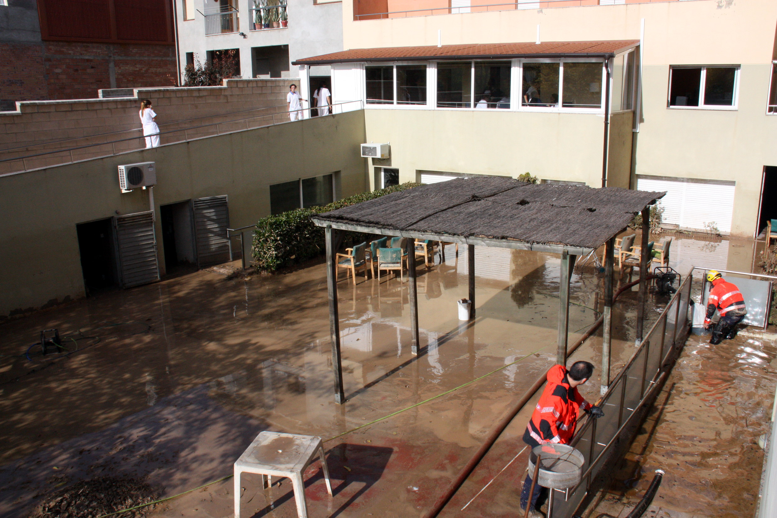 Imatge del pati de l’interior de la residència geriàtrica Ribera del Sió d’Agramunt amb Bombers treballant per retirar aigua, el 3 de novembre 2015. (Horitzontal)