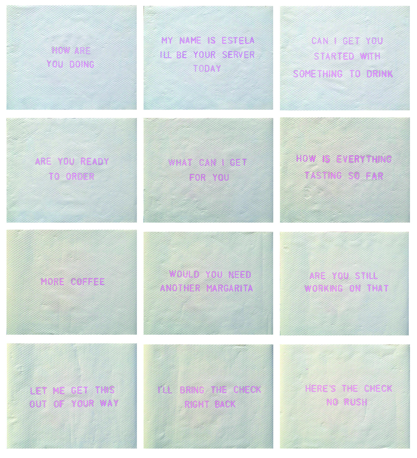 The serving handbook: standard appropriate expresions documenta les frases que utilitzen els cambrers en els restaurants als Estats Units d’Amèrica. Tot i que no responen a cap manual preestablert, els cambrers de tot el país sembla que segueixin un patró comunicatiu determinat. En un sistema de salari basat en les propines, el servei es ven com un producte estàndard en el seu estat més ideal i eficient, a fi de buscar un impacte que presenti el major benefici econòmic, però en complet detriment de l’autenticitat i personalitat individuals.