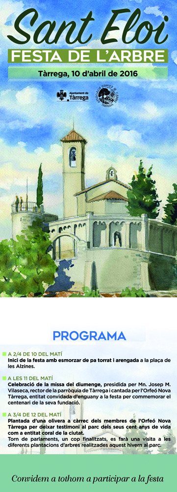 L’Associació dels Amics de l’Arbre, amb més d’un segle dedicat al manteniment del Parc de Sant Eloi, convida com cada any la ciutadania a descobrir la riquesa natural i paisatgística de la serra tot just arribada la primavera. És la Festa de l’Arbre de Tàrrega, que enguany tindrà lloc aquest diumenge 10 d’abril. Aquesta vegada, l’entitat convidada serà l’Orfeó Nova Tàrrega, entitat que ha celebrat recentment el centenari de la seva fundació. L’efemèride es testimoniarà amb la plantada d’una olivera. Tot seguit, es proposarà de fer una ruta pels indrets reforestats al Parc de Sant Eloi durant els últims mesos. La Festa de l’Arbre compta amb el suport de l’Ajuntament de Tàrrega. El Parc de Sant Eloi és la principal zona verda urbana de la capital de l’Urgell, és de titularitat municipal i ocupa 17 hectàrees d’extensió.
