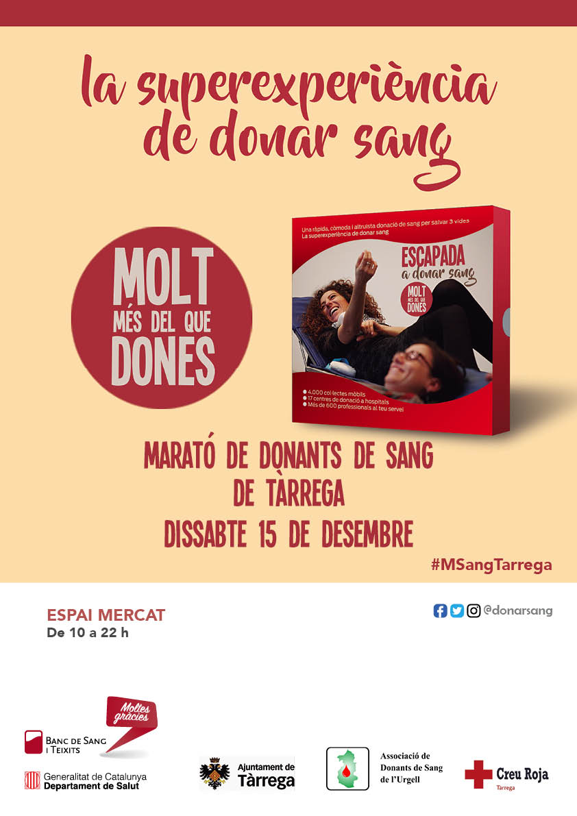 Marató de Donació de Sang que tindrà lloc a Tàrrega el dissabte 15 de desembre, de 10 del matí a 10 de la nit, a l’Espai MerCAT (Plaça de les Nacions sense Estat). Serà una iniciativa solidària per nodrir les reserves d’hospitals i salvar vides. La crida compta amb la col·laboració de l’Ajuntament de Tàrrega, Creu Roja Tàrrega i l’Associació de Donants de Sang de l’Urgell. Com a novetat, enguany els donants rebran un SMS quan la seva sang sigui enviada a un hospital per a ser transfosa. Tàrrega sensibilitza sobre la importància de donar sang com un hàbit per a estendre aquesta pràctica entre el màxim nombre de ciutadans. Cal tenir en compte que cada dia calen 1.000 donacions a Catalunya per atendre les necessitats.