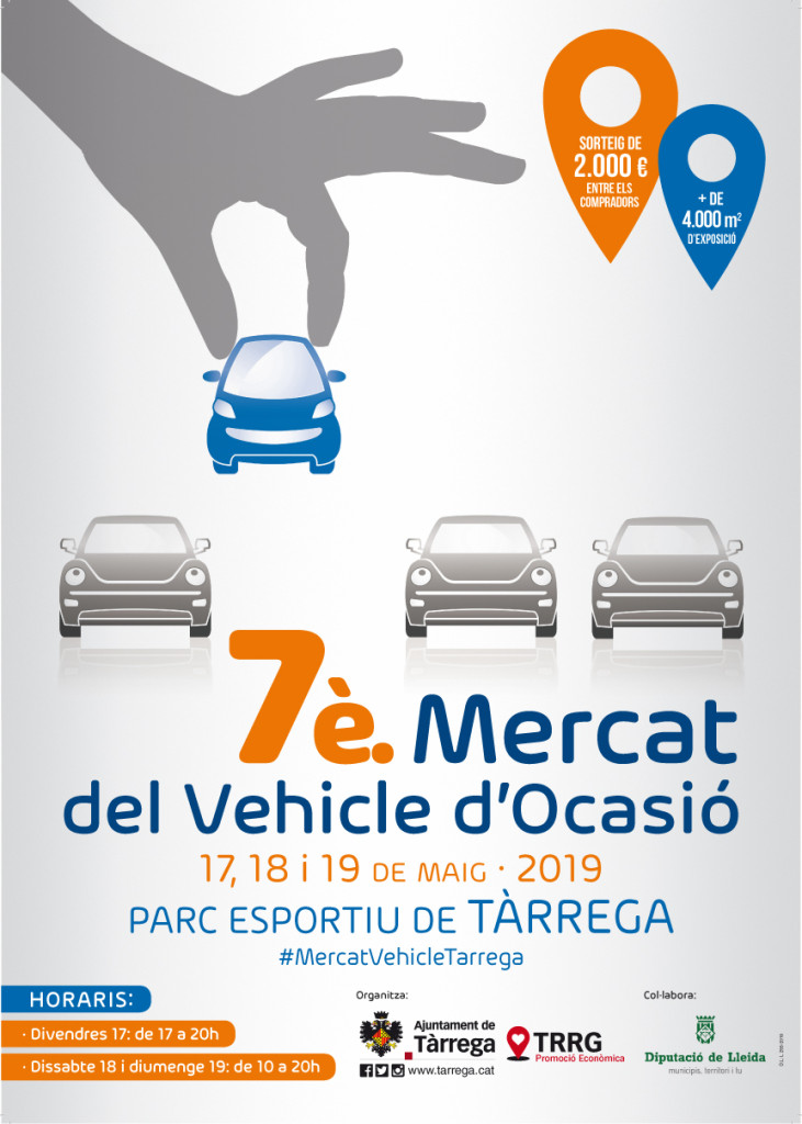 Tàrrega es prepara per celebrar la setena edició del Mercat del Vehicle d’Ocasió els dies 17, 18 i 19 de maig. Val a dir que enguany el certamen s’ha avançat una setmana en el calendari firal. El recinte d’exposició, ubicat al Parc Esportiu, ocuparà més de 4.000 metres quadrats amb més de 350 models de quilòmetre 0, gerència i seminous de les principals marques. Organitzat per la Regidoria de Promoció Econòmica, el certamen compta amb la participació de gairebé tot el sector de l’automoció de Tàrrega, als quals se sumaran altres concessionaris provinents de Lleida, Balaguer, Artesa de Segre i Les Borges Blanques. En total, hi seran presents una quinzena d’expositors amb les millors ofertes del sector i plena garantia. Els visitants interessats a adquirir un vehicle hi trobaran bones oportunitats per a totes les butxaques, des de les més econòmiques de la “zona outlet” fins a automòbils de gamma alta. A més, s’ofereix la possibilitat de provar els cotxes abans de formalitzar l’operació de compravenda. L’horari del divendres 17 serà de 5 de la tarda a 8 del vespre mentre que el dissabte 18 i el diumenge 19 serà de 10 del matí a 8 del vespre.