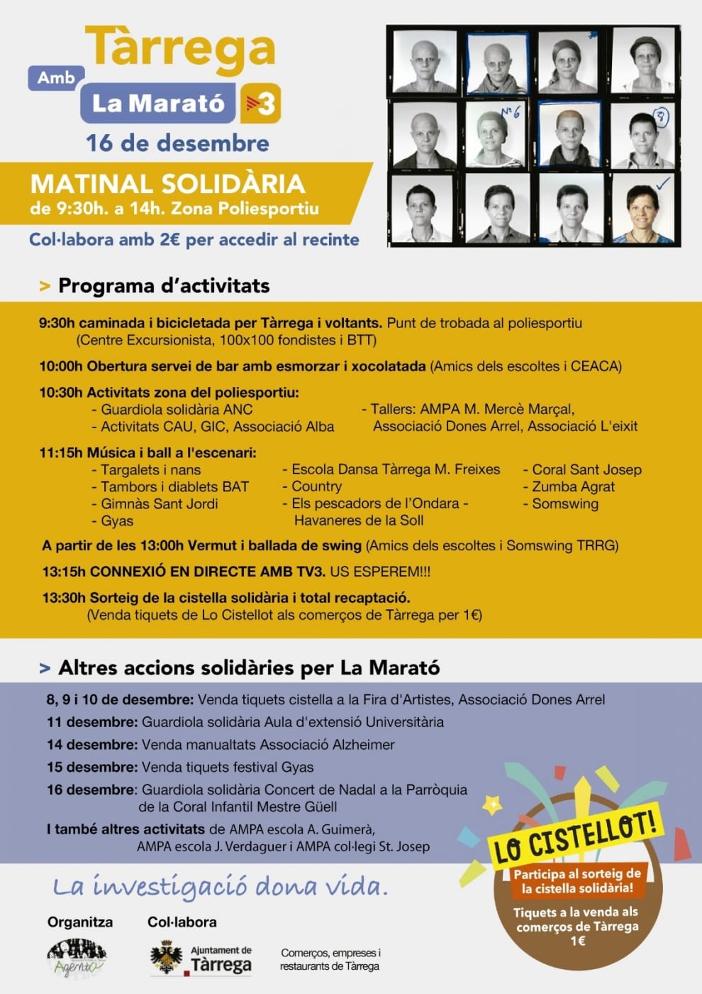 L’AgEnTa rebrà el suport d’altres entitats que formen part del col·lectiu a través d’un ampli ventall de voluntaris i tots els beneficis que es recaptin durant la jornada aniran destinats a La Marató de Tv3. L’acte compta amb el suport de l’Ajuntament de Tàrrega i Ràdio Tàrrega.