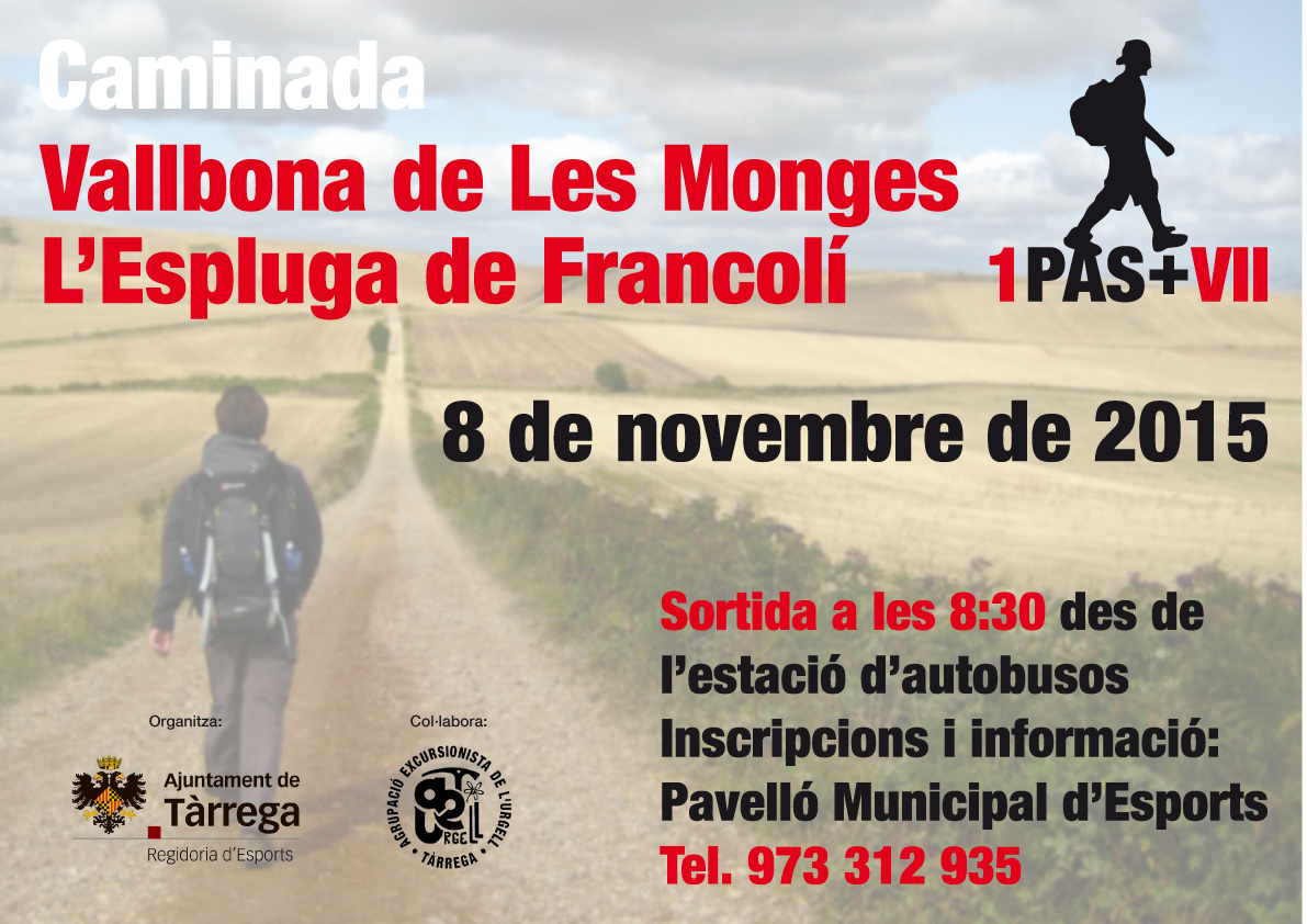 La Regidoria d’Esports de Tàrrega, amb el suport de l’Agrupació Excursionista de l’Urgell, organitza un nou cicle de caminades per a fomentar entre la ciutadania aquest hàbit saludable. Sota el nom d’1 pas + i per setè any consecutiu, es proposen una sèrie de sortides a peu els diumenges al matí per indrets naturals del territori. La primera caminada del calendari tindrà lloc aquest diumenge 8 de novembre recorrent 18 quilòmetres entre Vallbona de les Monges (Urgell) i L’Espluga de Francolí (Conca de Barberà). El desnivell total acumulat serà d’uns 200 metres. Els participants sortiran prèviament en autocar des de l’Estació d’Autobusos de Tàrrega a 2/4 de 9 del matí per a desplaçar-se fins a Vallbona de les Monges. El cicle 1 Pas + inclourà quatre caminades més durant la present temporada esportiva. El preu d’inscripció és de 10 euros, tràmit que es formalitza al Pavelló Municipal d’Esports (tel. 973 31 29 35 · [email protected]).
