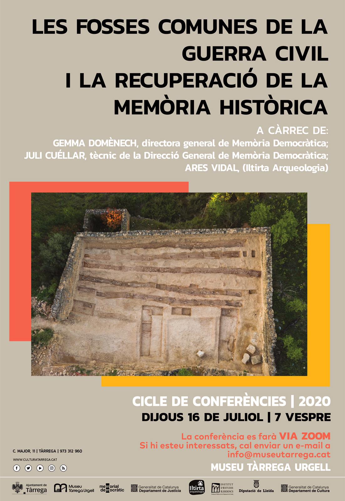 El Museu Tàrrega Urgell organitza aquest dijous 16 de juliol a les 7 de la tarda una nova conferència via telemàtica que girarà al voltant de les fosses comunes de la Guerra Civil i la recuperació de la Memòria Històrica. La cita es podrà seguir a través de l’aplicació Zoom mitjançant inscripció prèvia al correu mailto:[email protected] i s’emmarca dins del cicle de conferències anual del museu.