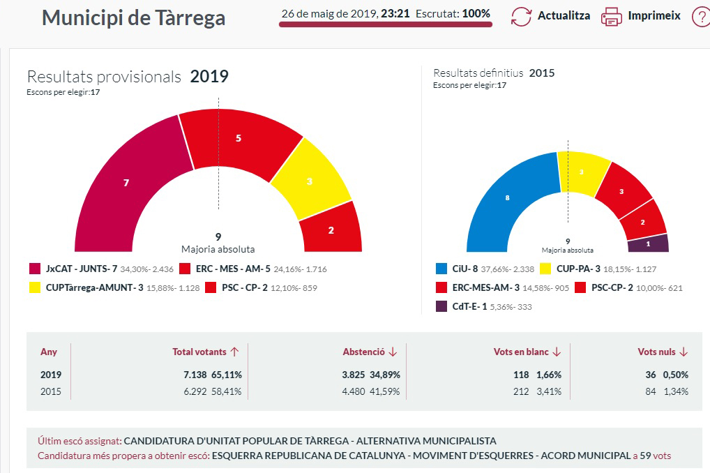 Tàrrega ha registrat en les Eleccions Municipals celebrades avui 26 de maig un índex de participació del 65,11%, xifra que suposa un augment de 7 punts per damunt de la registrada en els anteriors comicis locals de l’any 2015 (58,41%). Dels 10.963 electors i electores cridats a les urnes, han exercit el seu dret a vot un total de 7.138 persones.
