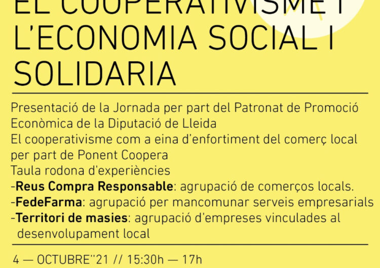 La jornada “Enfortiment del comerç local amb el cooperativisme i l’Economia Social i Solidària” serà el proper 4 d’octubre a les 15:30h i comptarà amb la participació de tres experiències: Reus Compra Responsable, Territori de Masies i FedeFarma
