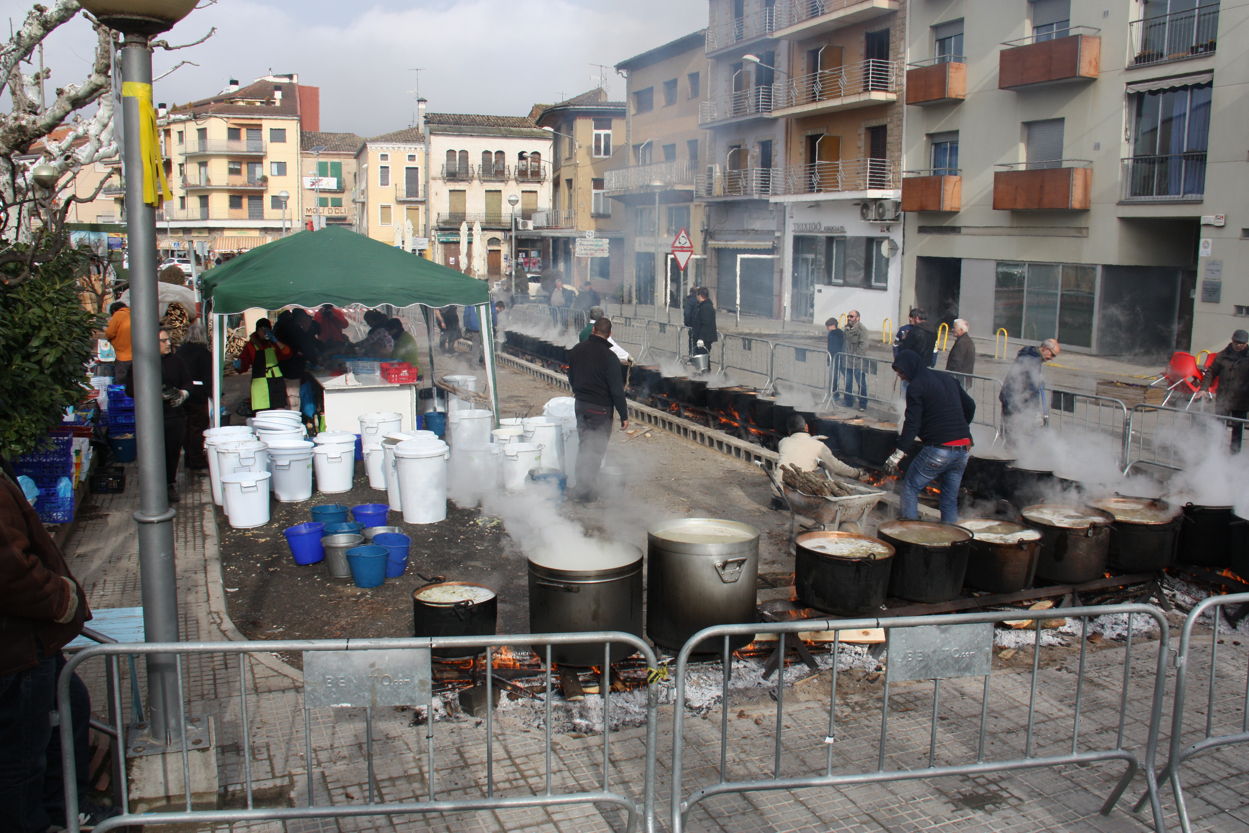 Pla general de les desenes de cassoles treient fum mentre s’elabora el popular ranxo de Ponts i on es veu una carpa on es preparen els ingredients, el 13 de febrer de 2018 (Horitzontal).