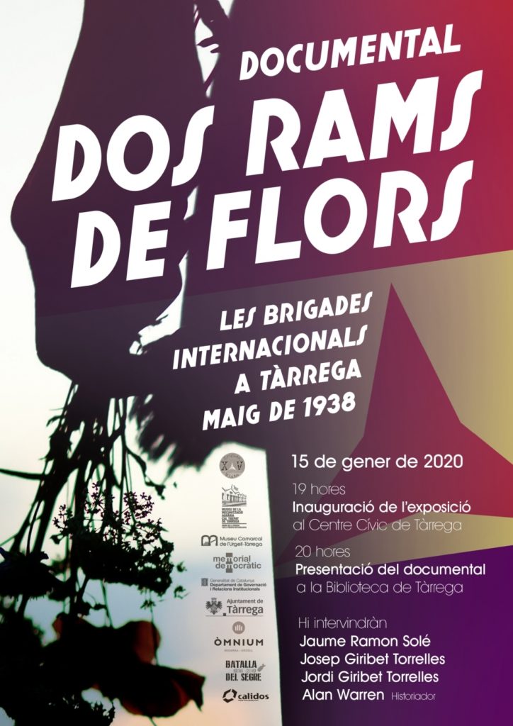 El dimecres dia 15 de gener, a les set de la tarda, es farà la presentació de l’exposició “Dos rams de flors: Exposició sobre l’estada de les Brigades Internacionals a la Segarra i a l’Urgell el maig de 1938” al Centre Cívic de Tàrrega, i a les vuit del vespre es farà la presentació del documental “Dos rams de flors” a la sala d’actes de la Biblioteca de Tàrrega.