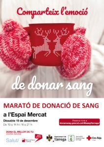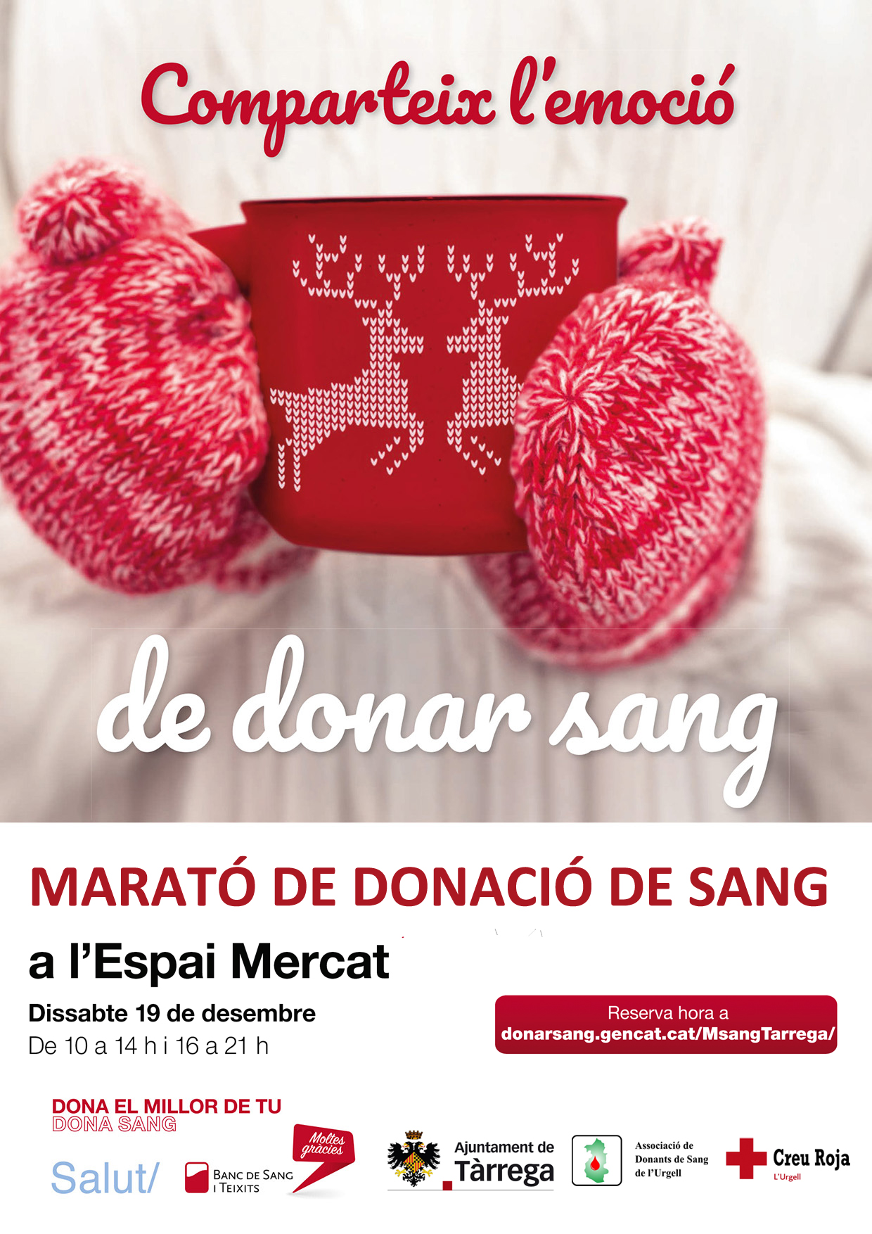 Tàrrega s’ha sumat al conjunt de municipis que han ofert els seus espais per garantir les donacions de sang a Catalunya durant aquests dies. El 19 de desembre, l´Espai Mercat comptarà amb un espai de donació de 10 a 14 i de 16 a 21 hores.
