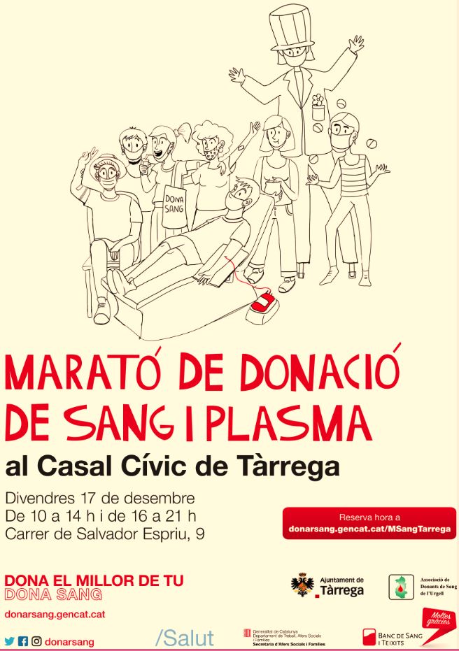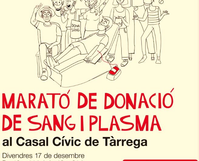 La Marató de Donants de Sang arriba a Tàrrega el divendres 17 de desembre al Casal Cívic en horari de 10 a 14 h i de 16 a 20 h. L’objectiu és sumar 250 donacions entre sang i plasma. Les targarines i targarins podran reservar hora a través de l’enllaç donarsang.gencat.cat/MSangTarrega.