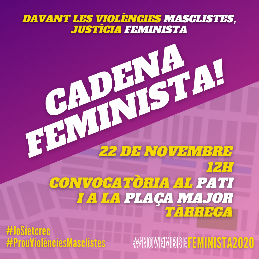La participació és clau per fer sentir en veu alta la condemna contra la violència de gènere. Així, el diumenge 22 de novembre, a les 12 del migdia, Tàrrega se sumarà a la Cadena Feminista convocada arreu per part del moviment Novembre Feminista. Enguany es denunciarà el fet que la pandèmia i el confinament han posat moltes dones en greus situacions de risc. Les trobades es faran a la plaça Major i la plaça del Carme amb mesures de seguretat sanitària i inscripció prèvia a [email protected].