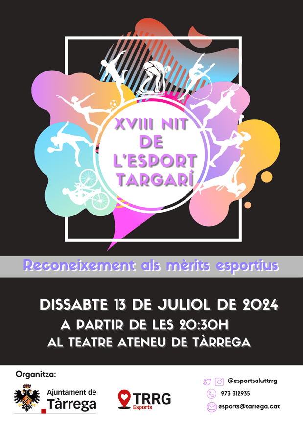 El dissabte 13 de juliol, Tàrrega celebrarà la 18a edició de la seva Nit de l’Esport per homenatjar les persones i entitats que han brillat en aquest àmbit durant la darrera temporada. Organitzat per la Regidoria d’Esports, l’esdeveniment presenta enguany tres tipus d’accèssits especials: projecció esportiva, destinat a joves talents que ja destaquen en les seves disciplines; trajectòria i resultats, com a reconeixement a esportistes i servidors de l’esport pels seus èxits i dedicació; i aniversaris d’entitats, com a celebració dels clubs i associacions que compleixen anys tot fomentant l’activitat física i l’esport a la ciutat.