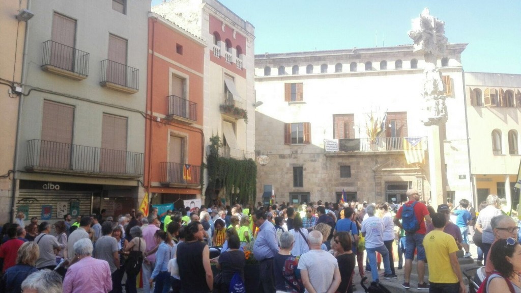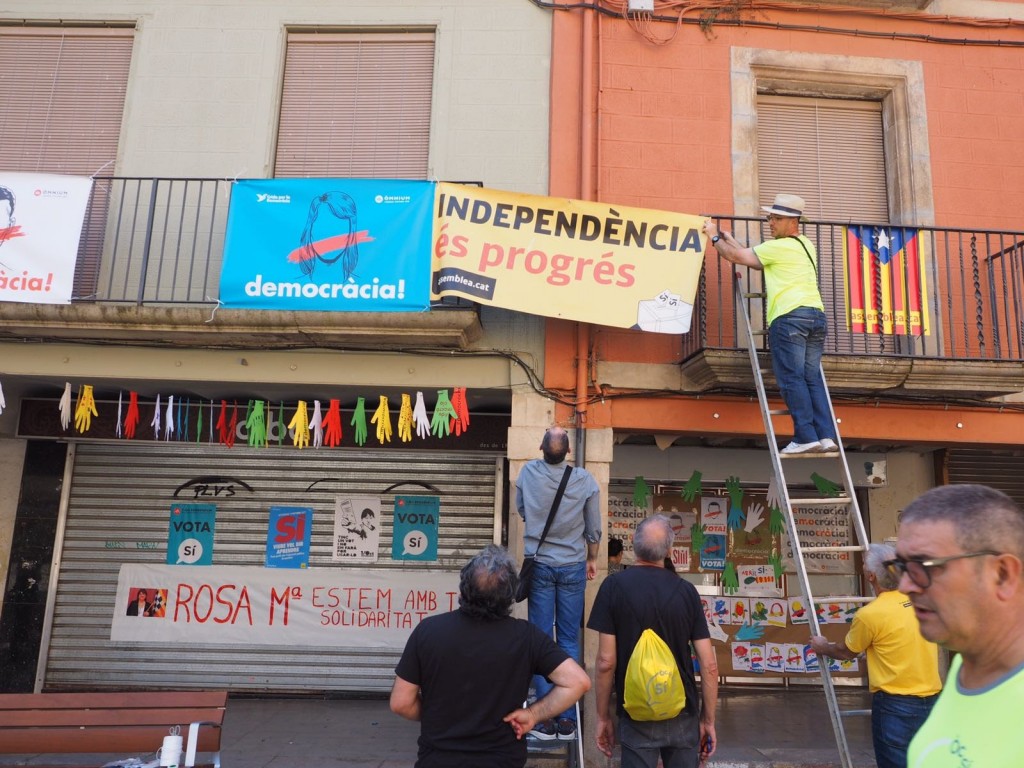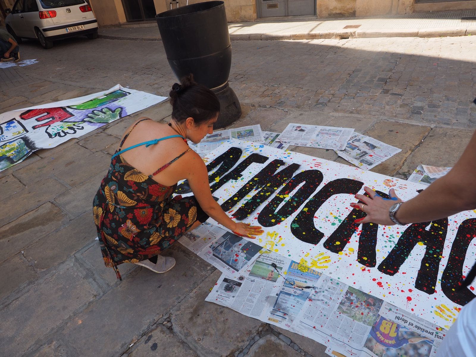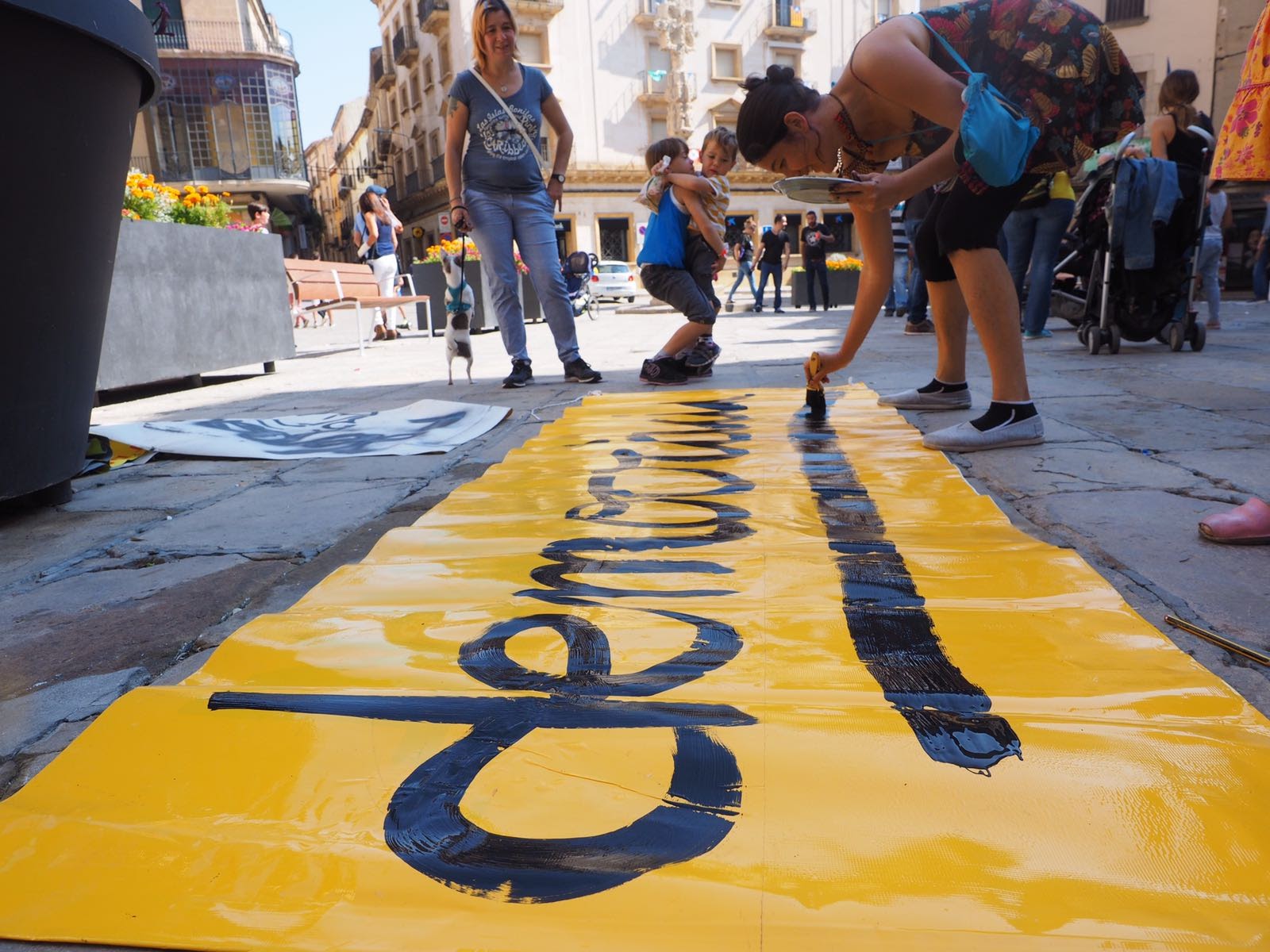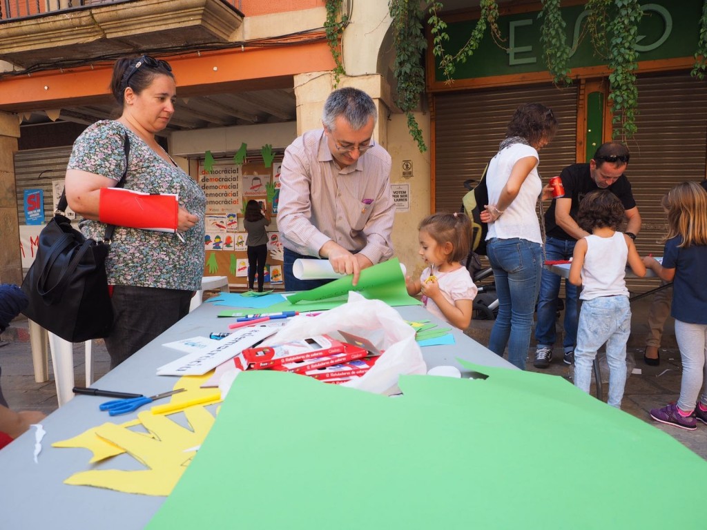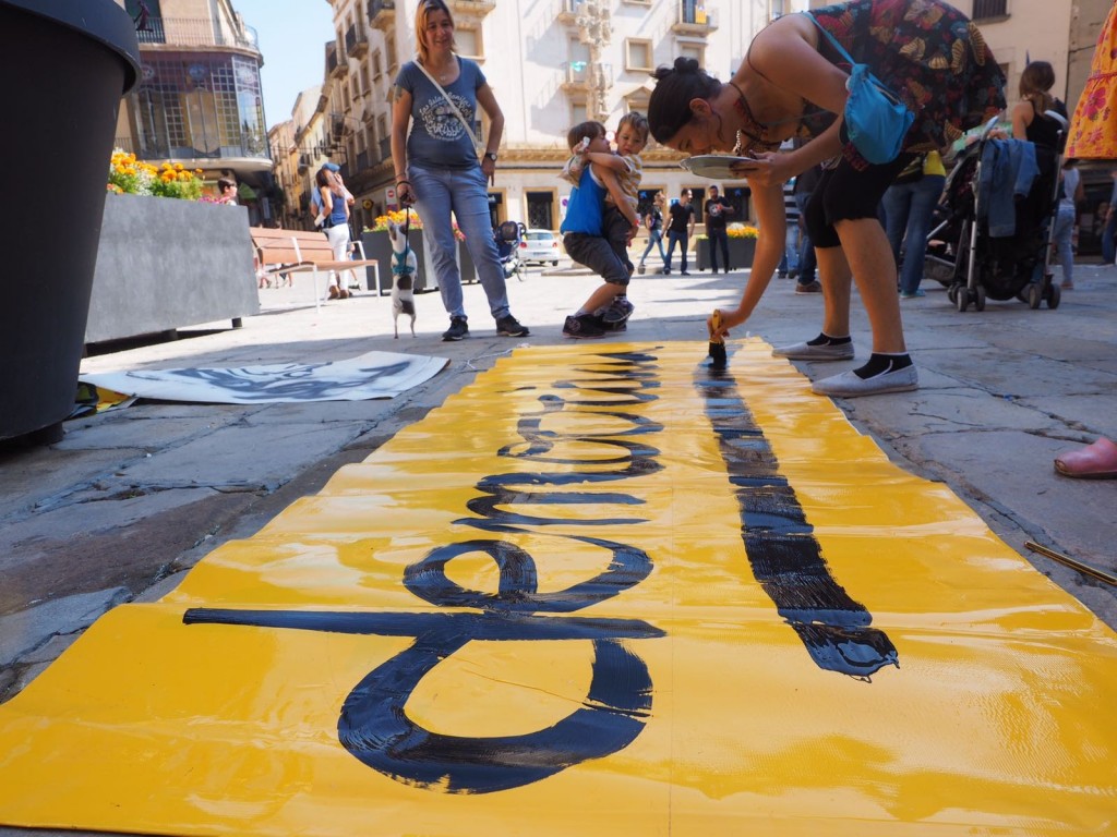 Des de la plaça Major s’han ofert diferents tallers per confeccionar pancartes que els participants han omplert de missatges a favor de la democràcia, la Independència, en suport a l’alcaldessa i reclamant el dret a votar.