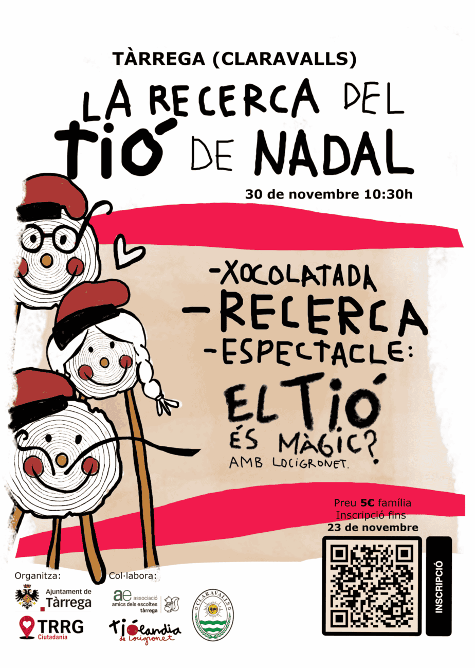 Tàrrega impulsa per cinquè any consecutiu l’activitat nadalenca ‘La recerca del tió’, una proposta lúdica i familiar que enguany tindrà lloc a Claravalls. La iniciativa ha tingut un destacat èxit de convocatòria els darrers anys i convida els infants i les famílies a viure una aventura plena de màgia tot buscant els tions amagats en plena natura.
