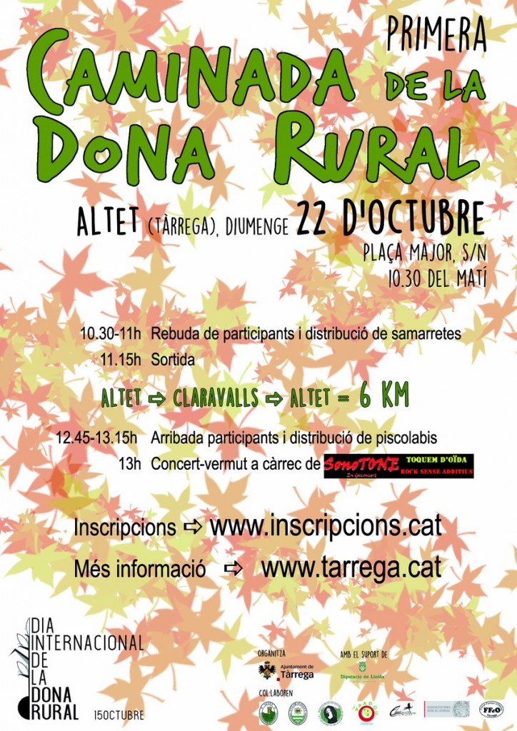 L’Ajuntament de Tàrrega impulsa una nova activitat que conjuga salut, promoció del territori i reivindicació del paper de les dones en el desenvolupament rural. Es tracta de la Caminada de la Dona Rural, la primera edició de la qual es desenvoluparà aquest diumenge 22 d’octubre. L’activitat és oberta no només a les dones sinó també a homes i infants que tinguin ganes de passejar pels pobles del terme i gaudir de l’entorn. La trobada tindrà lloc al Local Social d’Altet (Plaça Major) a partir de 2/4 d’11 del matí, quan es rebran els participants i es distribuiran les samarretes. Després, a 1/4 de 12 del migdia se sortirà en direcció a Claravalls per tornar cap a Altet, recorrent un itinerari total de 6 quilòmetres. A l’arribada s’oferirà un piscolabis saludable a base de fruita.